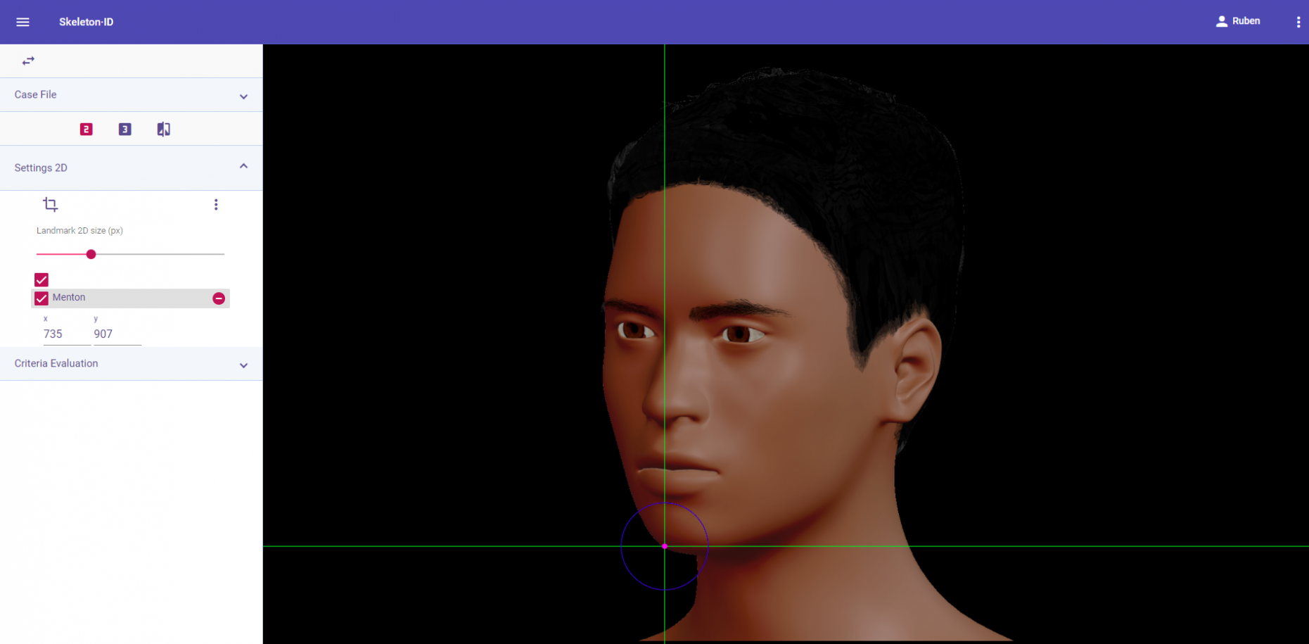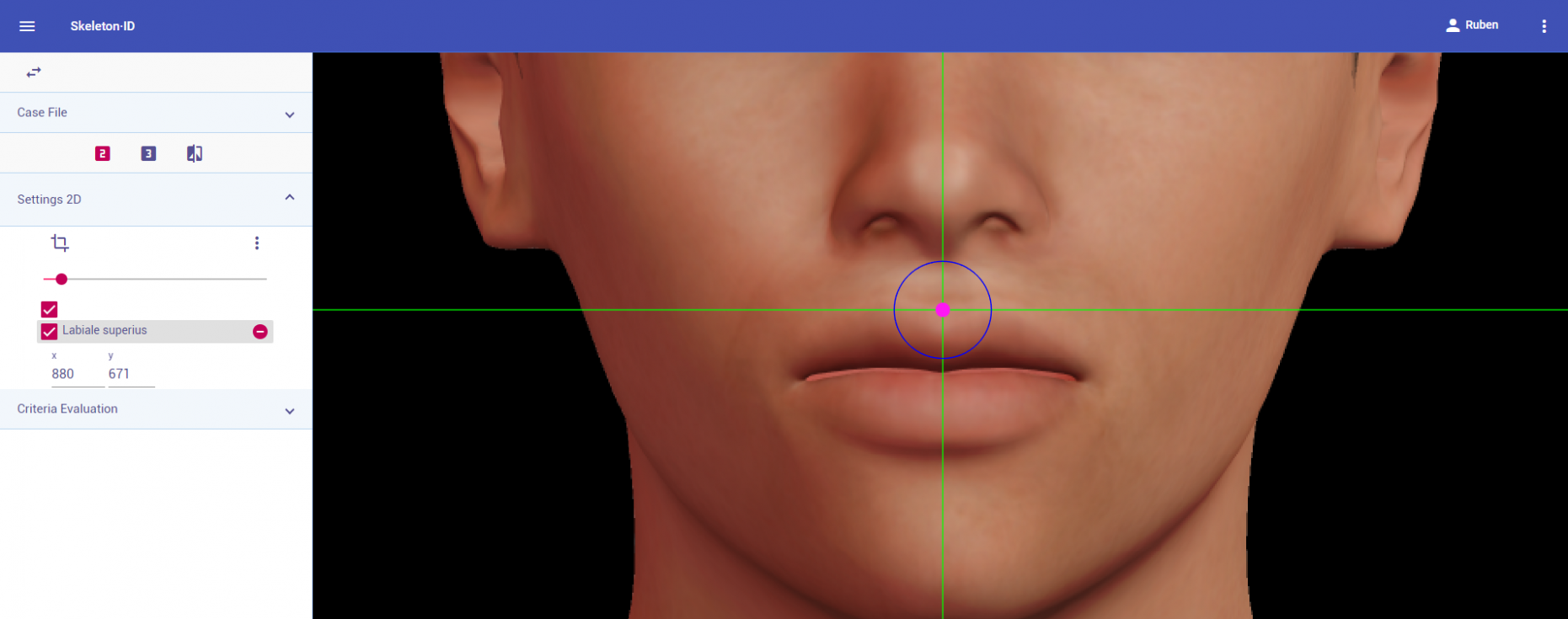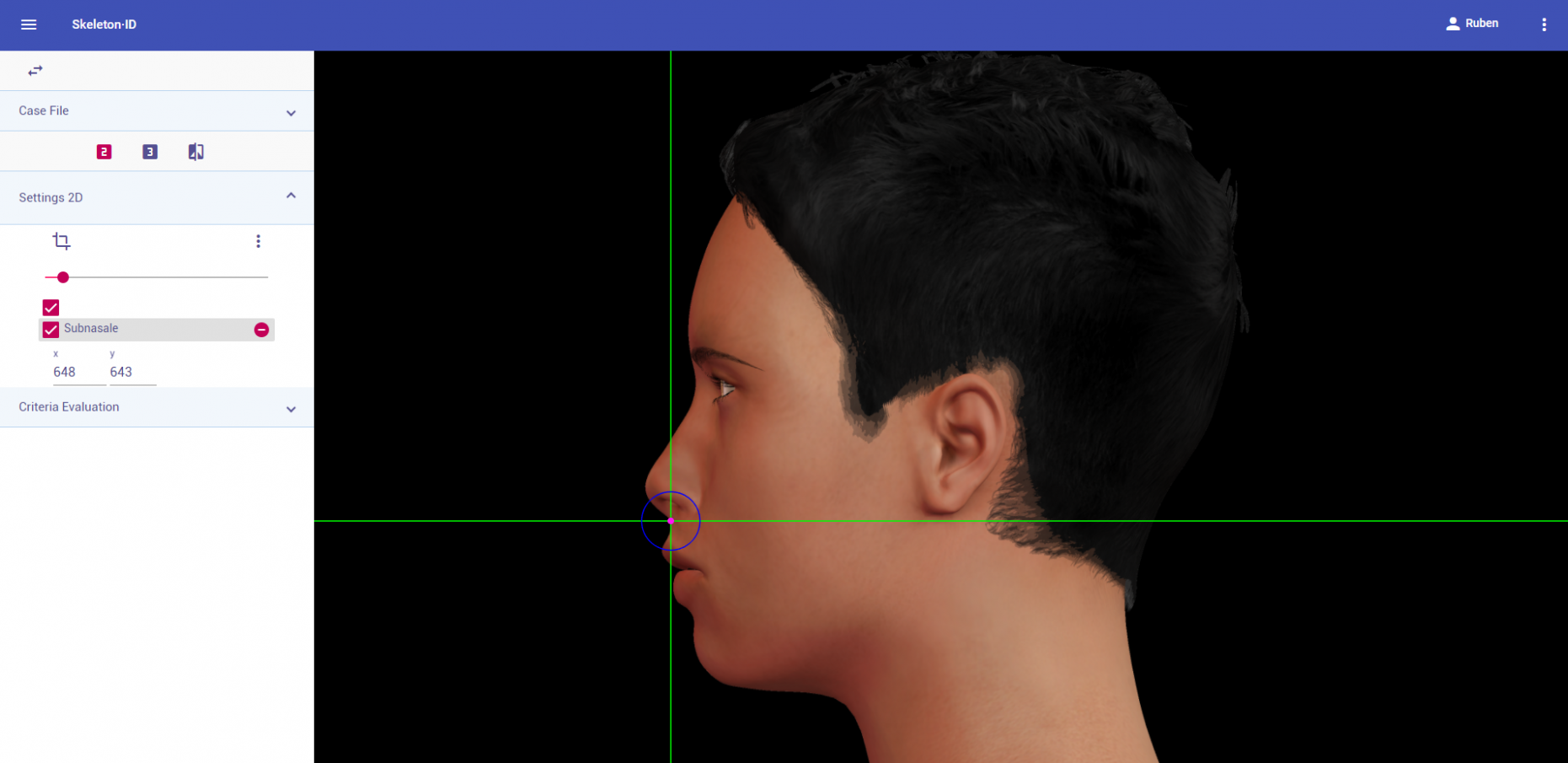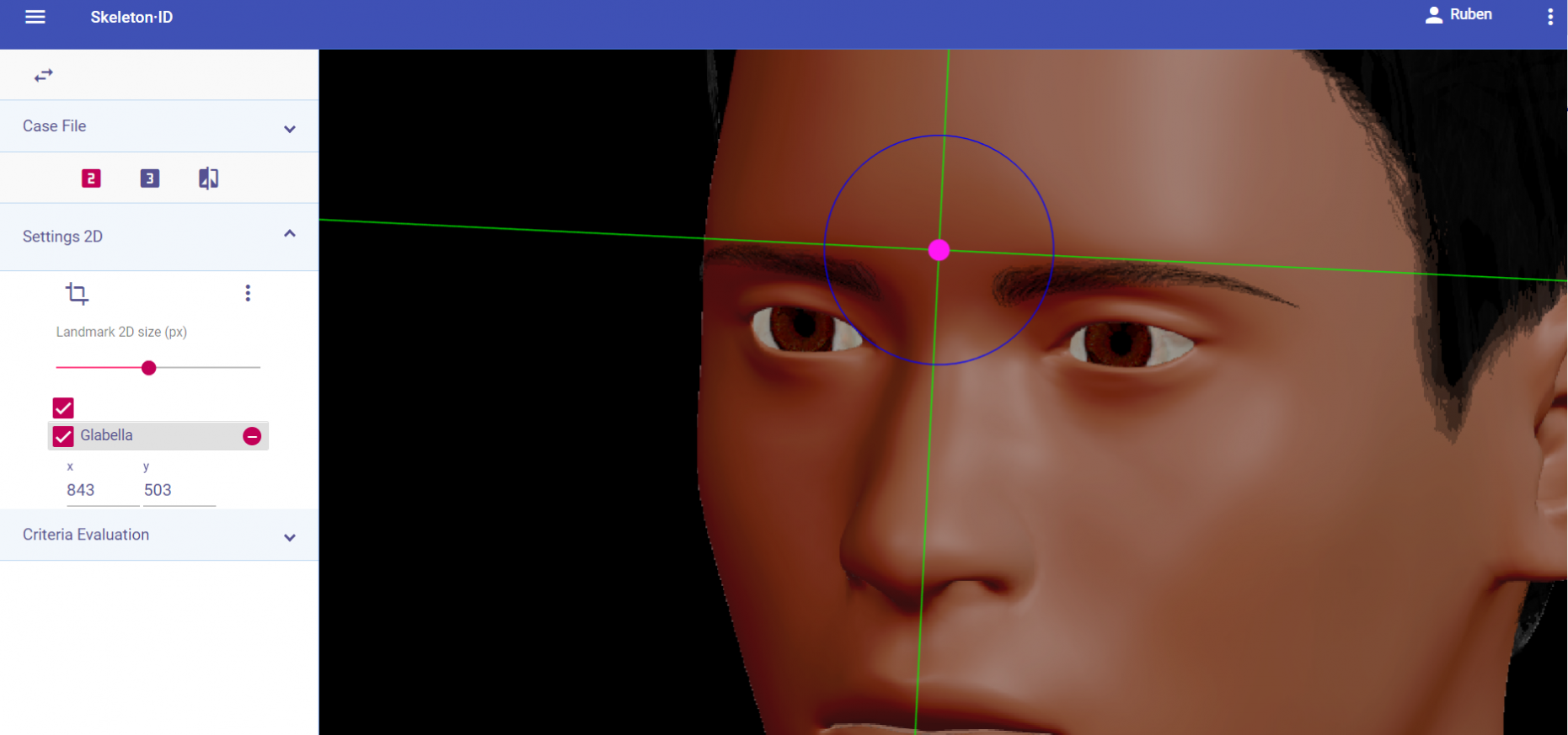 Place glabella at the midpoint of the forehead at the level of the brow ridge. Use the vertical and horizontal auxiliary line as reference. The vertical line should be located at the midpoint of the brow ridges and the horizontal line on the upper edge of the eyebrows. Note that it may be necessary to rotate the axis of the auxiliary lines to position the horizontal line on the eyebrows.