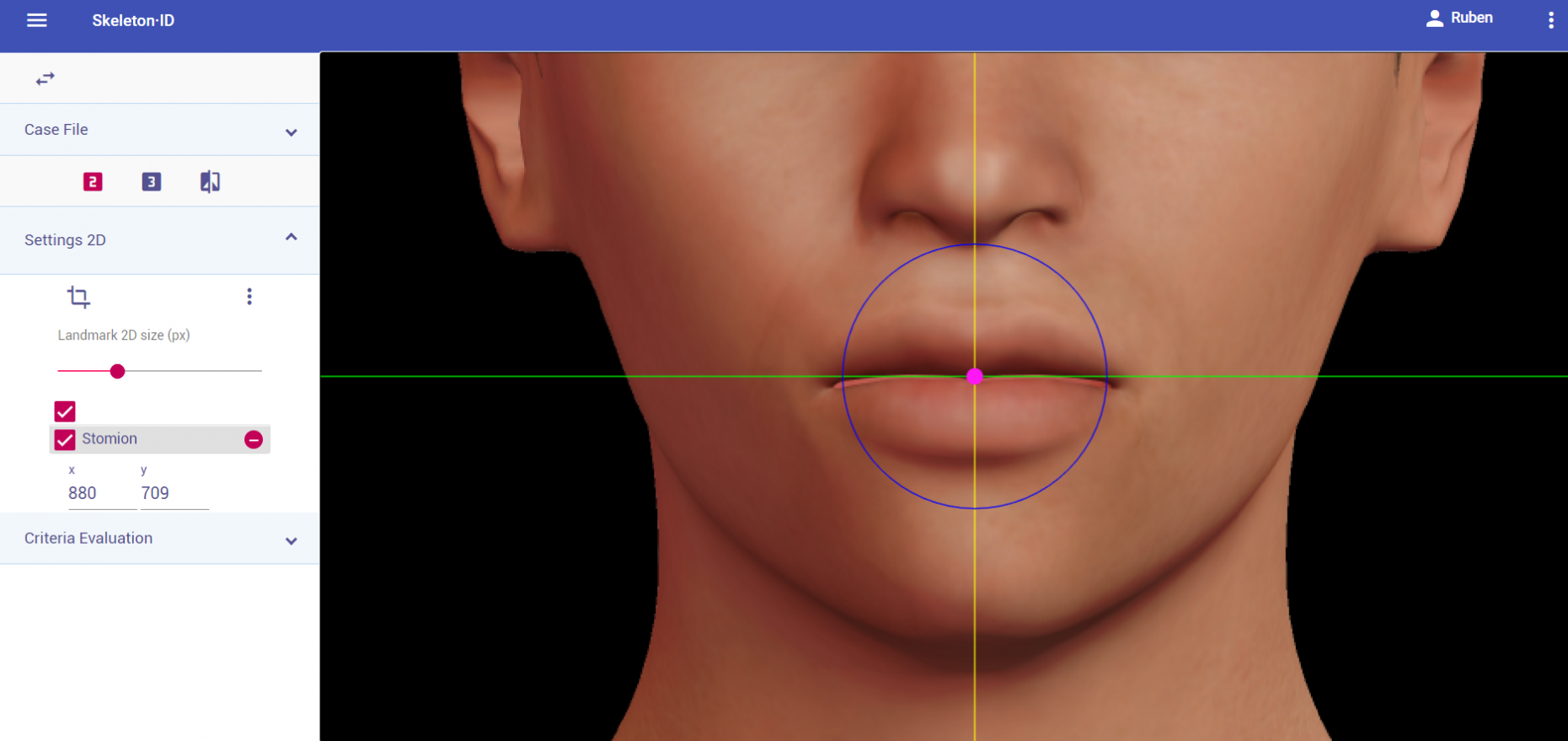 Place labiale superius in the superior edge of the vermillion border of the upper lip (transition line at the intersection of the lip and the adjacent skin), in the vertex of the Cupid’s bow (middle region of the upper lip) in oblique view. The horizontal line should be placed over the border, at the vertex of the Cupid’s bow, and the vertical line in the midpoint of the vermillion border.