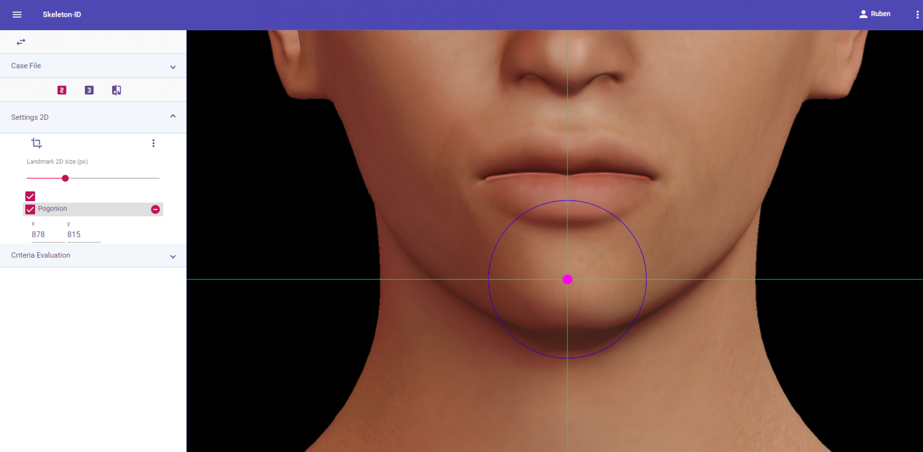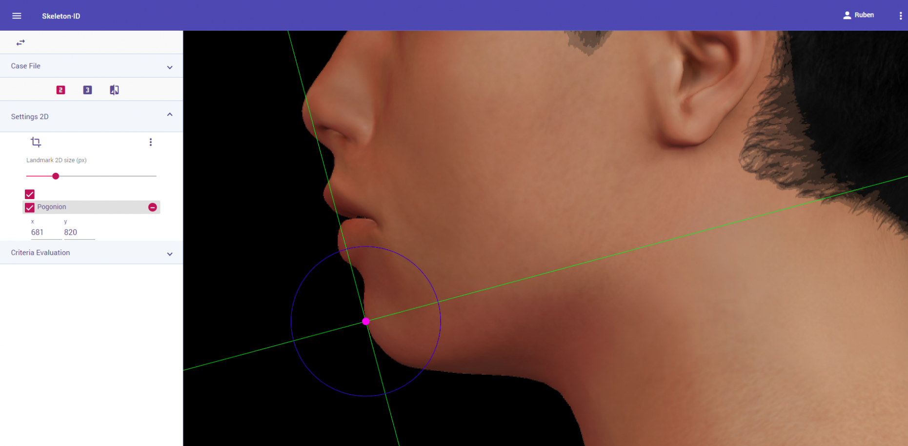 Place pogonion in the most anterior point of the mental protuberance in lateral view. The vertical auxiliary line should be placed in the most anterior point of the curve of the mental protuberance and the horizontal auxiliary line at this height Note that it may be necessary to rotate the auxiliary lines’ axis in order to determine this point.
