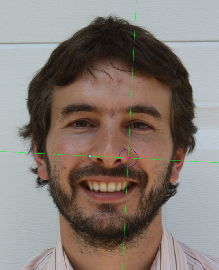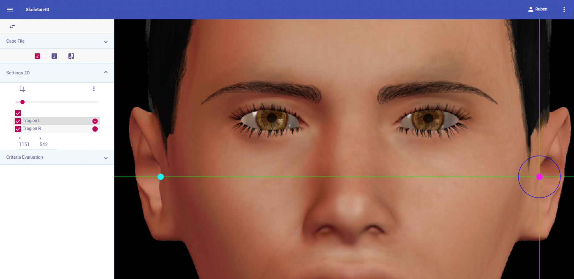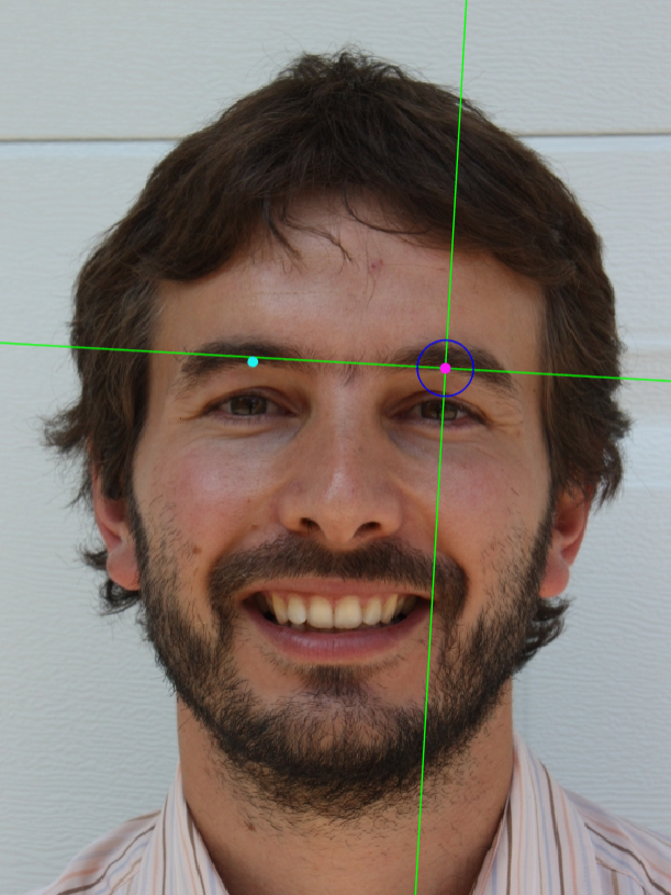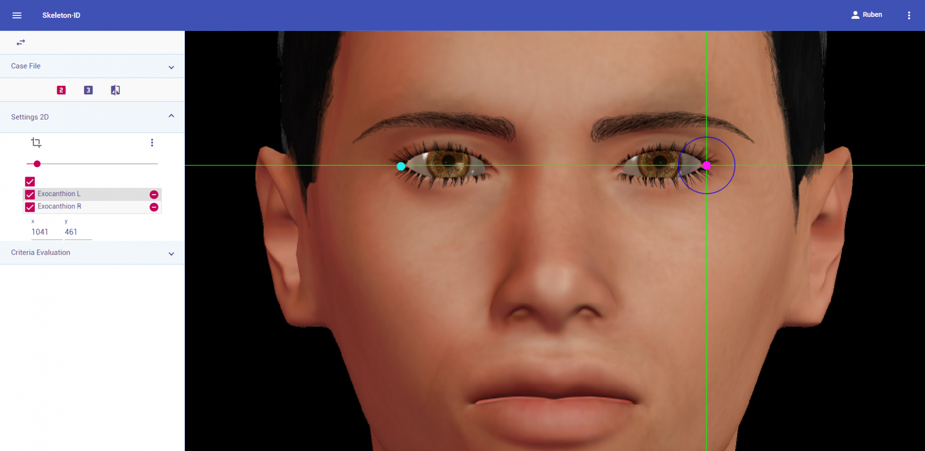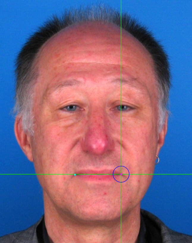 Zoom in on the corresponding eye and place the mouse pointer over the medial canthus where the upper and lower lash lines converge in frontal view. Place the vertical auxiliary line on the medial border of the palpebral fissure and the horizontal auxiliary line where the two lash lines converge. Follow the same procedure for the contralateral landmark.