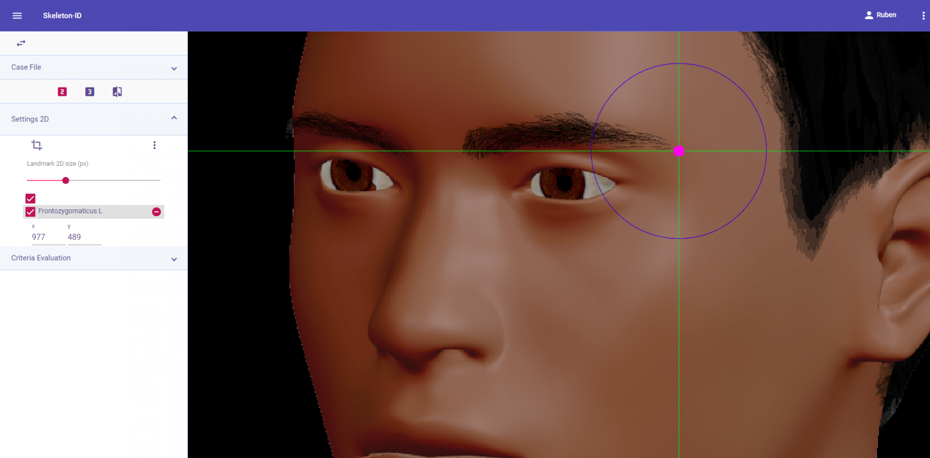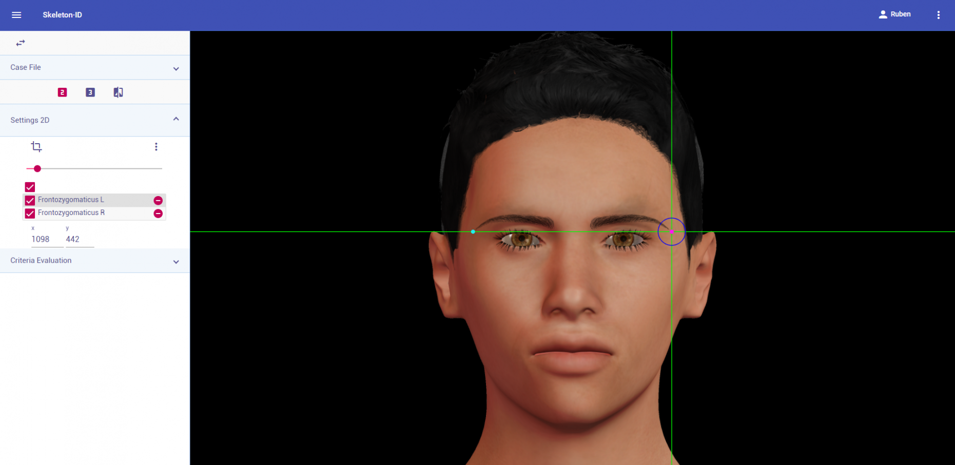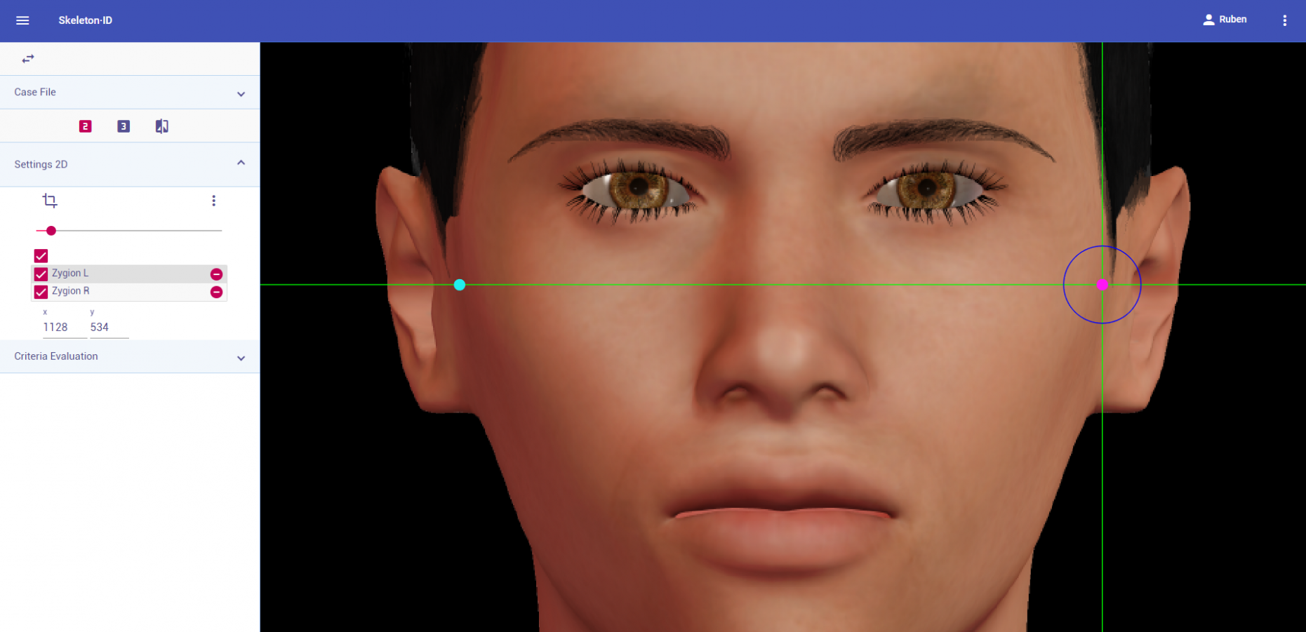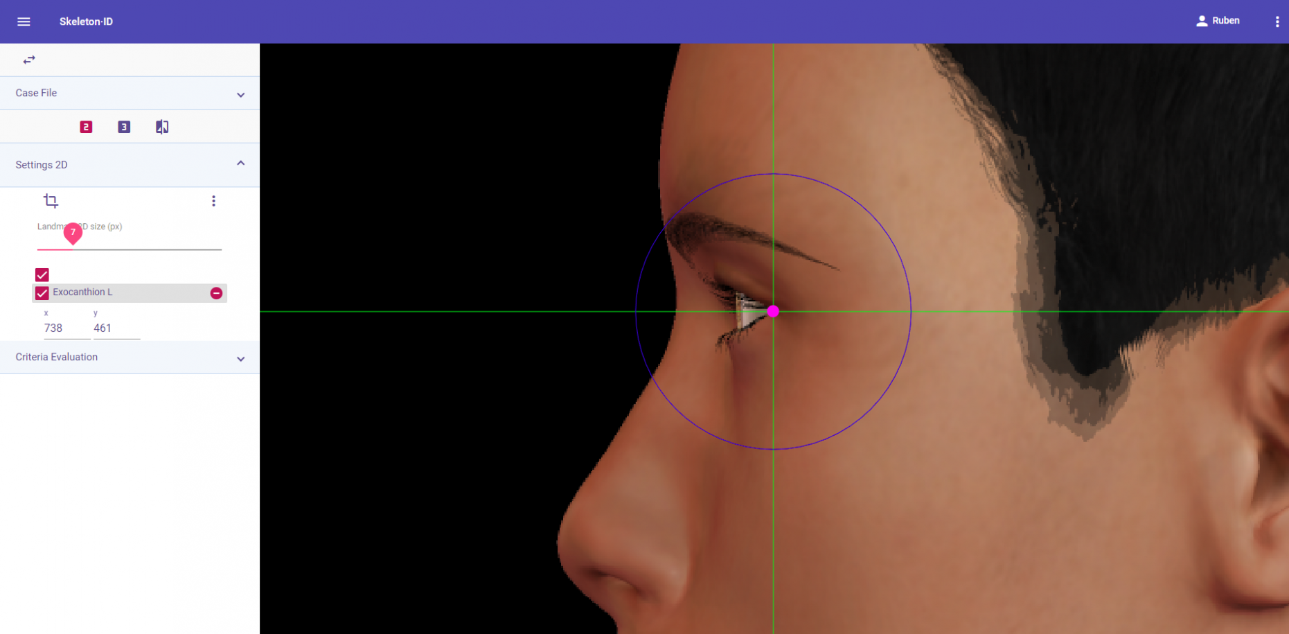Zoom in on the corresponding eye and place the mouse pointer over the medial canthus where the upper and lower lash lines converge in frontal view. Place the vertical auxiliary line on the medial border of the palpebral fissure and the horizontal auxiliary line where the two lash lines converge. Follow the same procedure for the contralateral landmark.