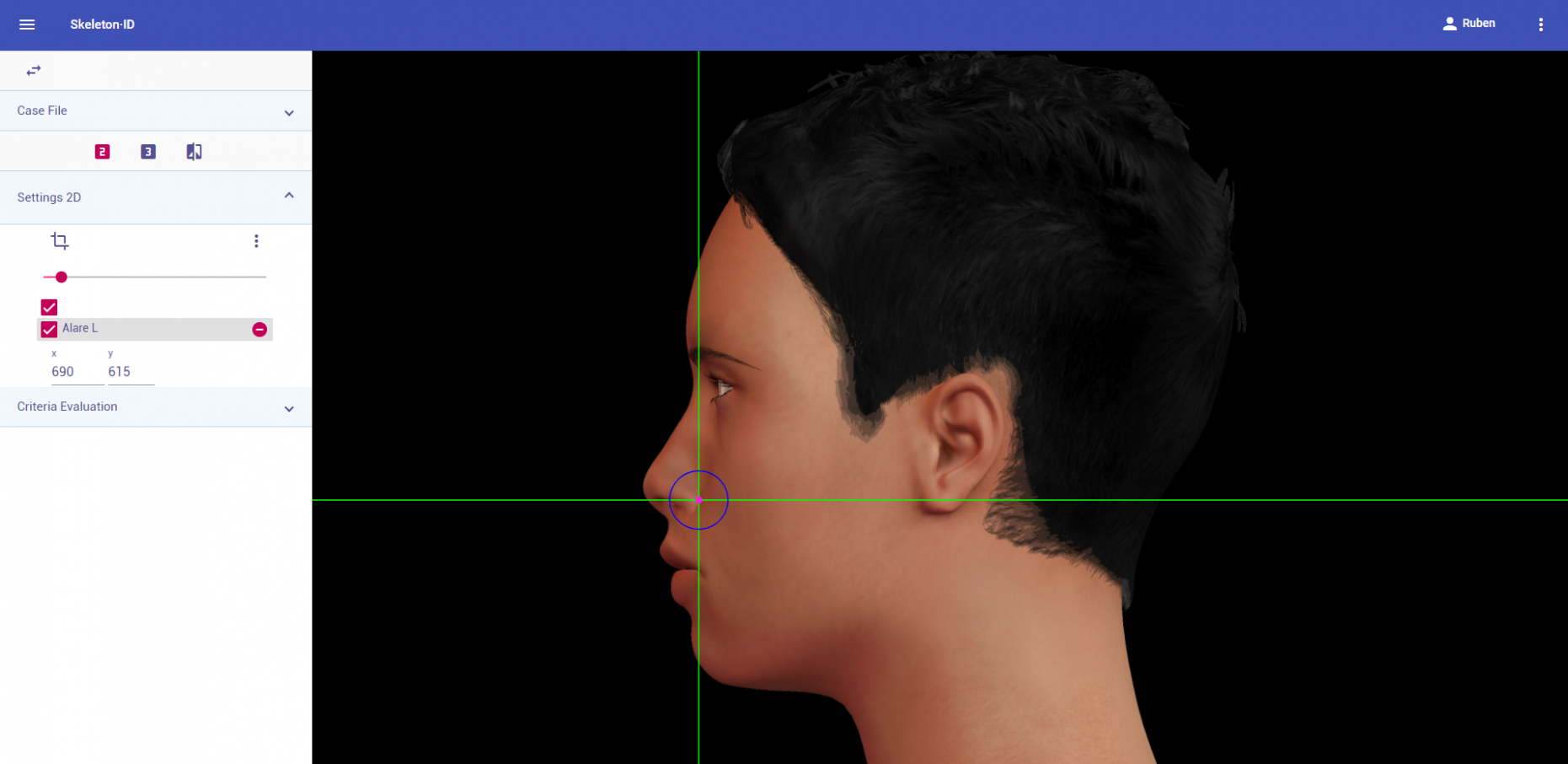 Place alare on the most lateral point of the nasal alae in frontal view. The vertical auxiliary line should be placed on the most lateral point of the nasal ala (it may be necessary to rotate the axis of the auxiliary lines to determine this point), and the horizontal auxiliary line should be placed on the maximum width of the nasal alae. Follow the same procedure for the contralateral landmark, which may not be at the same height, which means it may be necessary to rotate the horizontal line to find the most accurate alignment.