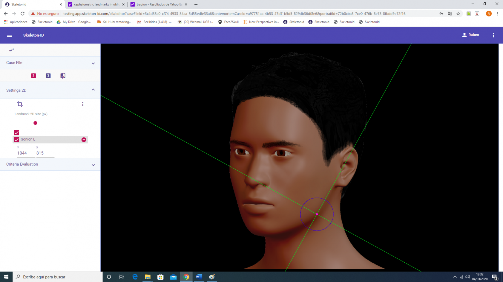 Place zygion on the most lateral point of each side of the width of the face in frontal view. The horizontal auxiliary line should be in the area of maximum width of the face (usually the root of the helix and the tragus) and the vertical auxiliary line should be on the edge of the lateral contour of the zygomatic arch. Follow the same procedure for the contralateral landmark.
