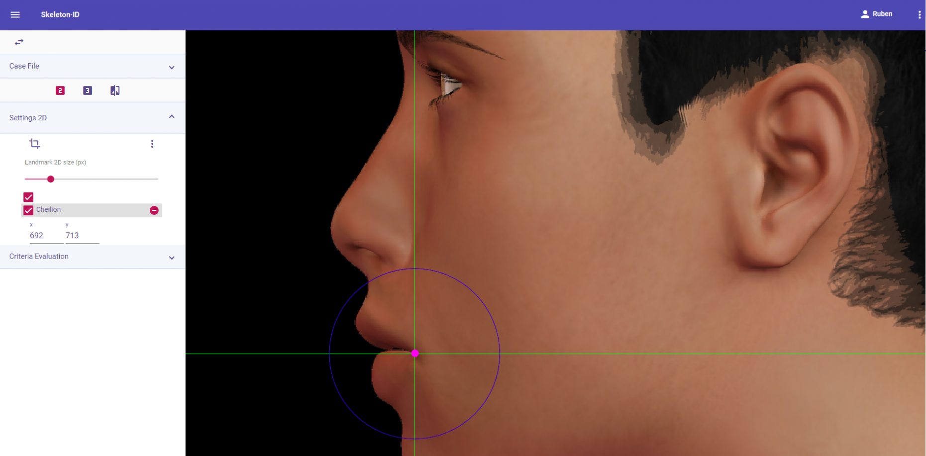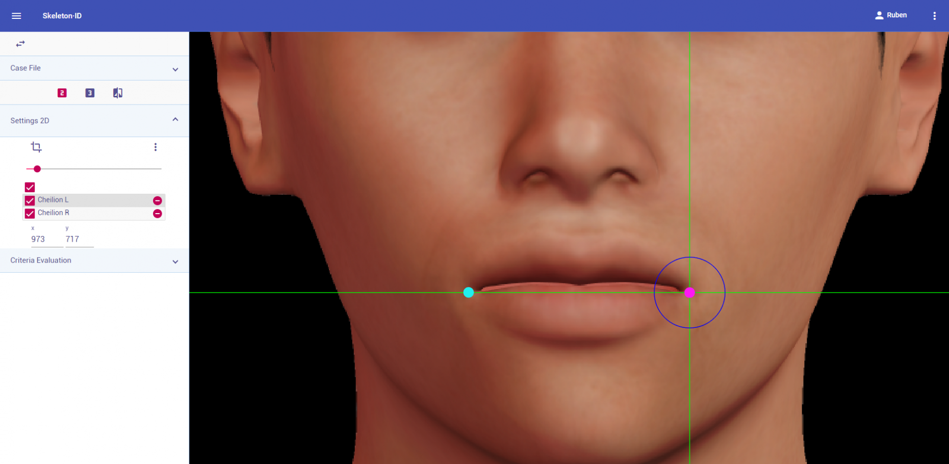 Place cheilion on the outer corners of the mouth in frontal view. The vertical auxiliary line should be placed on the commisure of the lips and the horizontal line should be placed at the point where the upper and lower vermillion borders meet. Follow the same procedure for the contralateral landmark, which may not be at the same height.