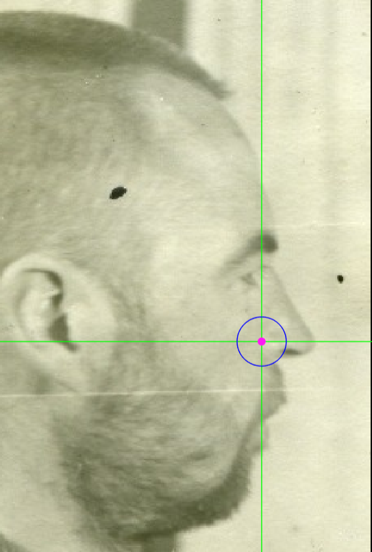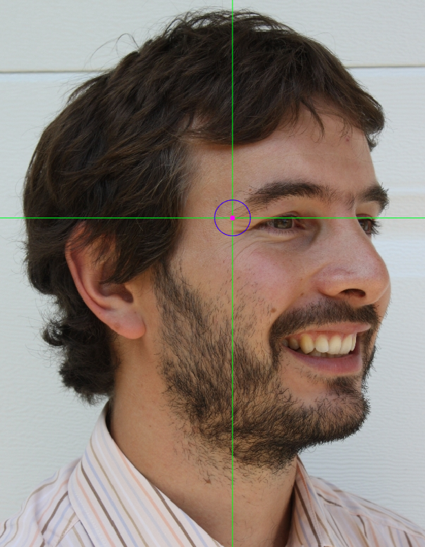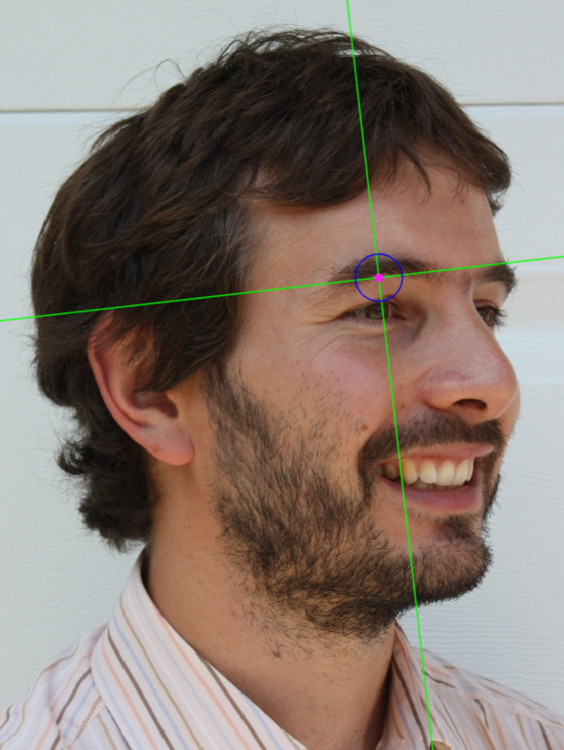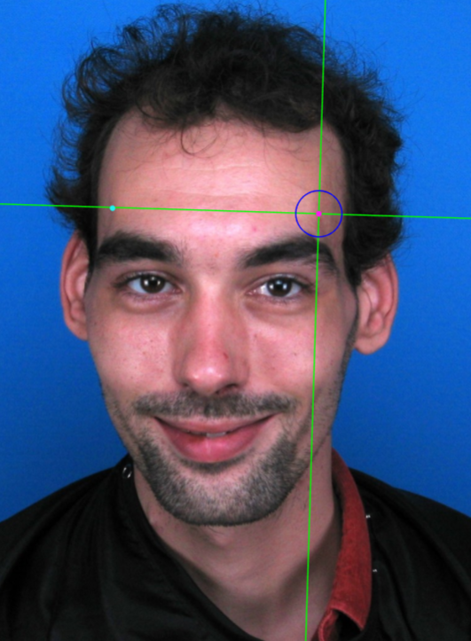 Zoom in on the corresponding eye and place the mouse pointer over the medial canthus where the upper and lower lash lines converge in oblique view. Place the vertical auxiliary line on the medial border of the palpebral fissure and the horizontal auxiliary line where the two lash lines converge. Note that the rotation of the head in oblique view might hinder the location of the medial canthus of one of the eyes.