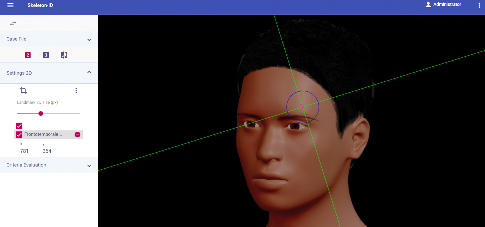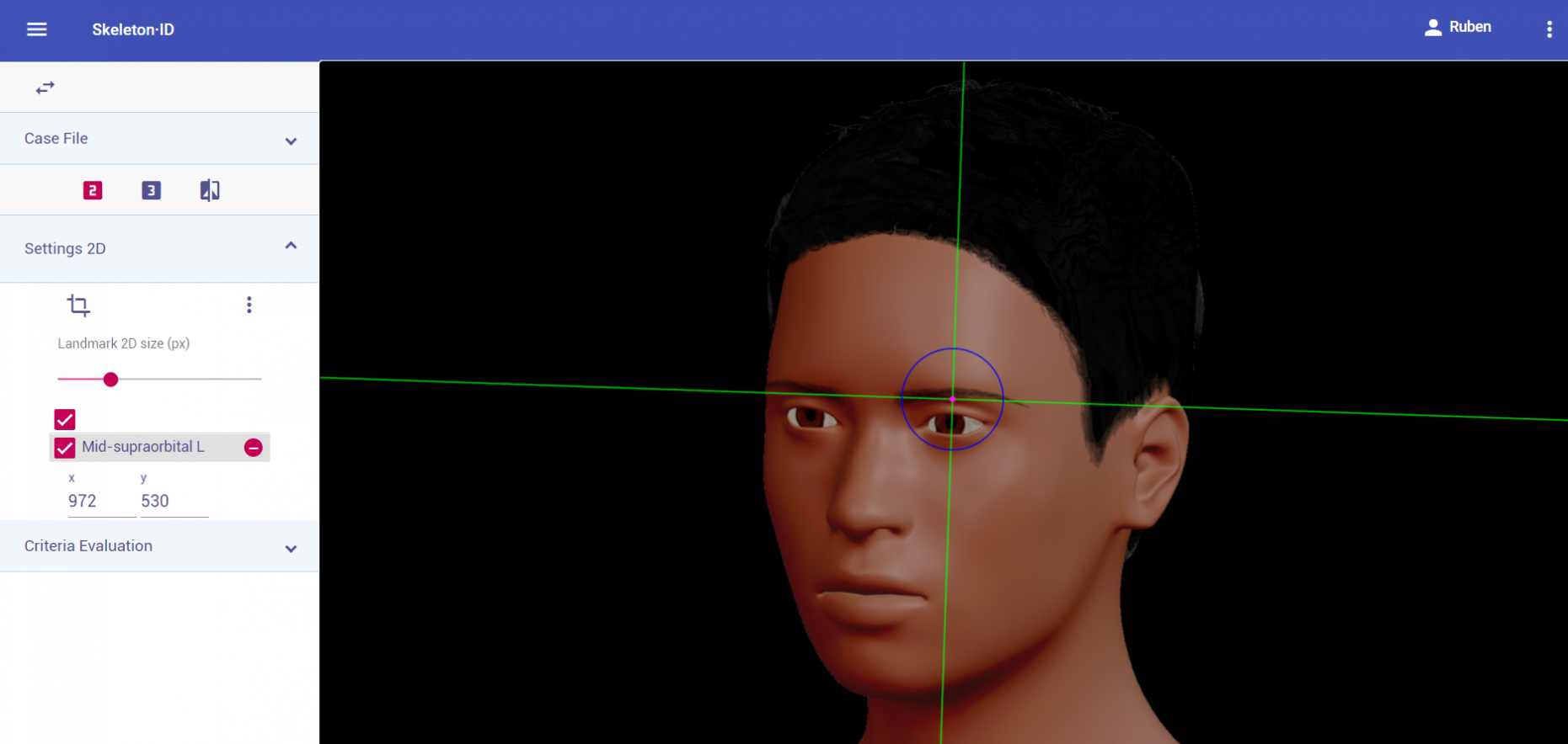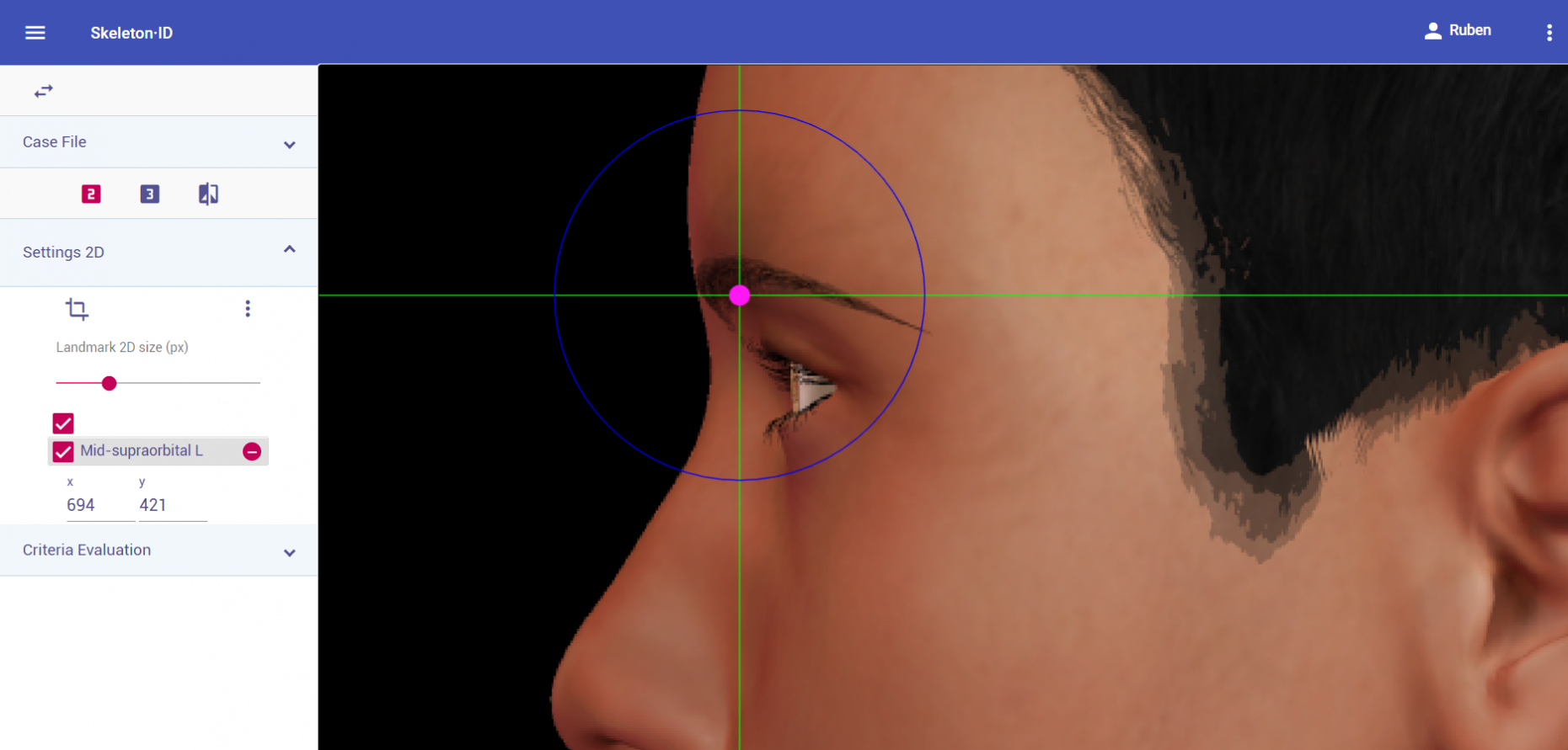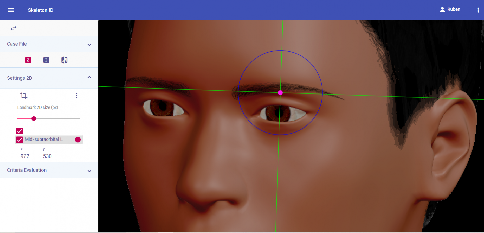 Place mid-supraorbital on the most inferior point of the upper orbital rim, in the median plane of the eye orbit. The horizontal auxiliary line should be placed on the upper border of the orbital rim (usually underneath the eyebrow) and the vertical auxiliary line should be in the median plane of the eye orbit. Note that depending on the face pose and orientation, it may be necessary to rotate the axis of the auxiliary line to accommodate the landmark. Follow the same procedure to place the contralateral point.