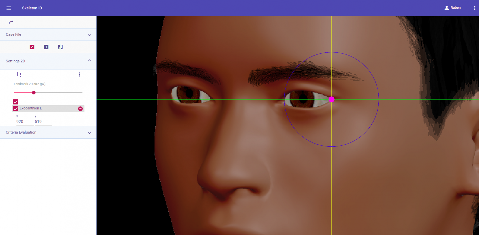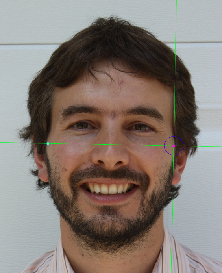 Zoom in on the corresponding eye and place the mouse pointer over the lateral canthus where the upper and lower lash lines converge in frontal view. Place the vertical auxiliary line on the lateral edge of the palpebral fissure and the horizontal auxiliary line where the two lash lines converge. Follow the same procedure for the contralateral landmark.