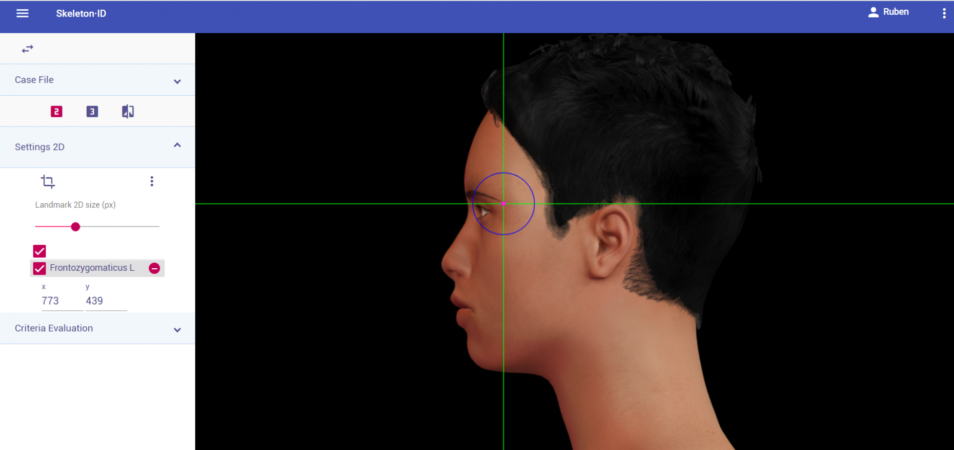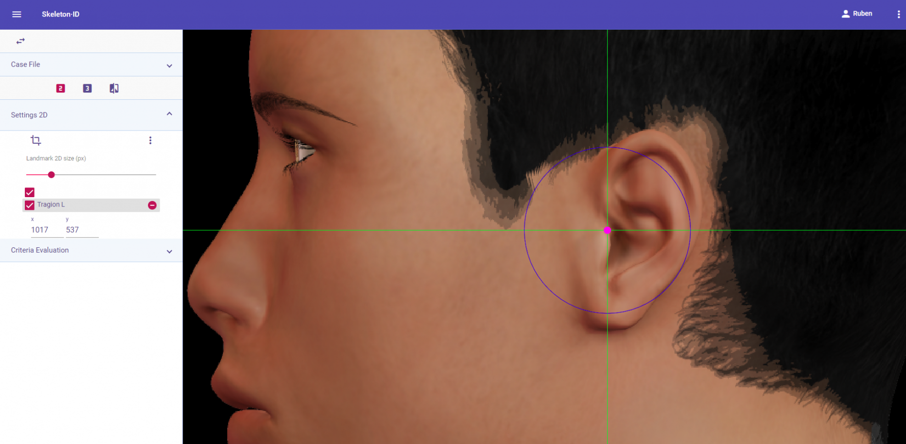 Place zygion on the rostral edge of the root of helix and tragus. The vertical auxiliary line should be anterior to the hairline (in the facial skin) and the horizontal auxiliary line should be between the root of helix and the tragus, aligning with the inferior orbital rim. Note that this landmark exhibits high variability in its placement in oblique view images due to the uncertainty associated to its estimation. It may be necessary to rotate the axis of the auxiliary lines in order to place them in the reference area and align them to the inferior orbital rim.