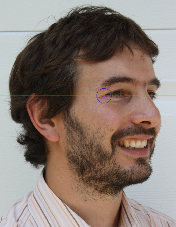 Zoom in on the corresponding eye and place the mouse pointer over the lateral canthus where the upper and lower lashlines converge in frontal view. Place the vertical auxiliary line on the lateral edge of the palpebral fissure and the horizontal auxiliary line where the two lashlines converge. Note that the rotation of the head in oblique view might hinder the location of the lateral canthus of one of the eyes.
