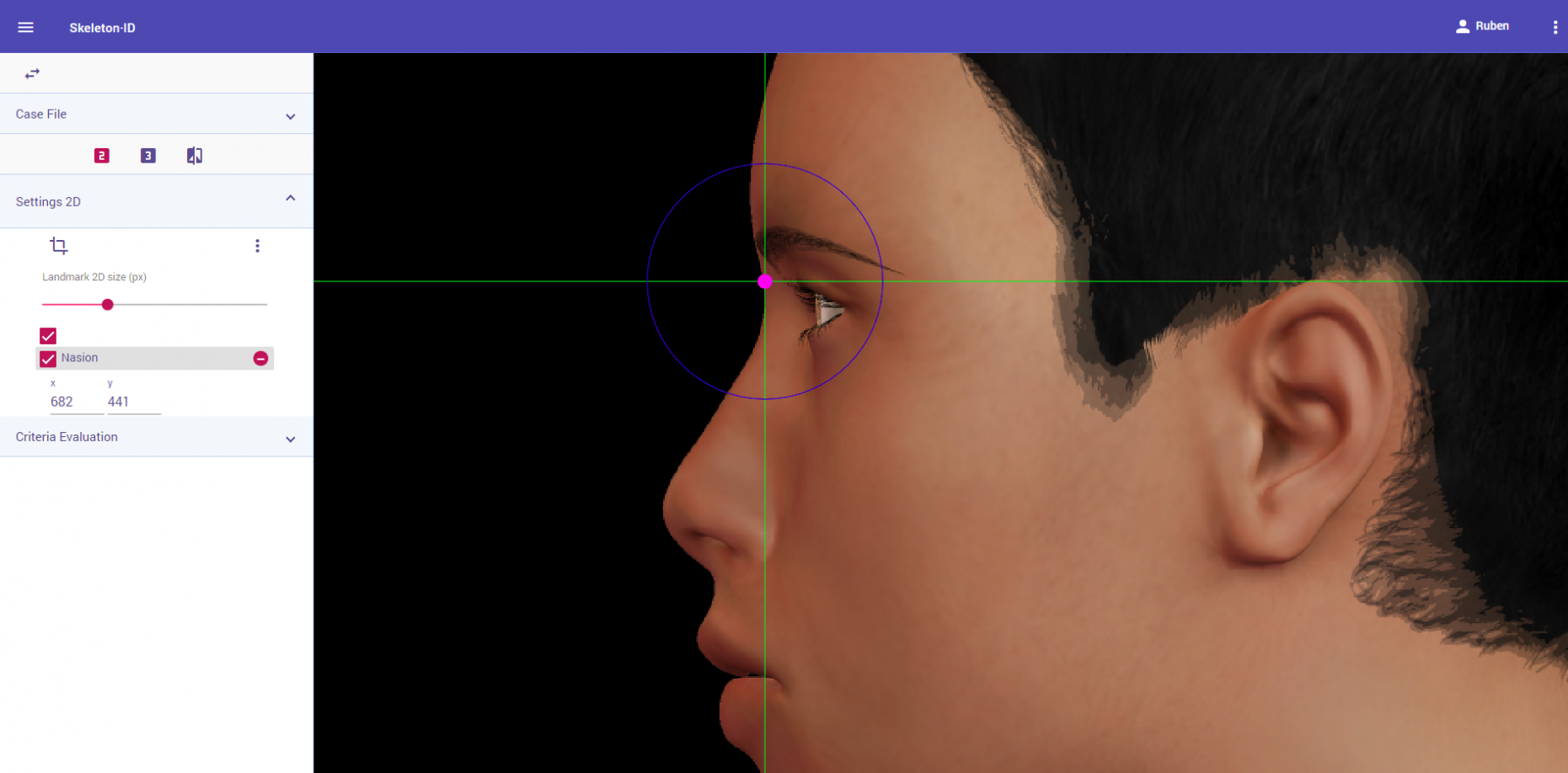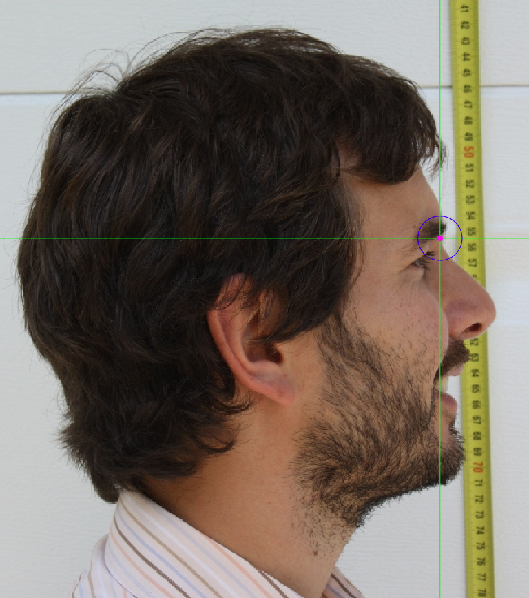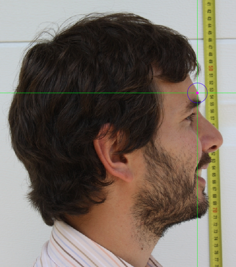 Colocar nasion en la raíz de la nariz, a la altura de la sutura nasofrontal en vista oblicua. La línea vertical debe estar colocada en el punto medio entre las cejas y la línea horizontal a la altura de la sutura nasofrontal (punto más superior del puente nasal).