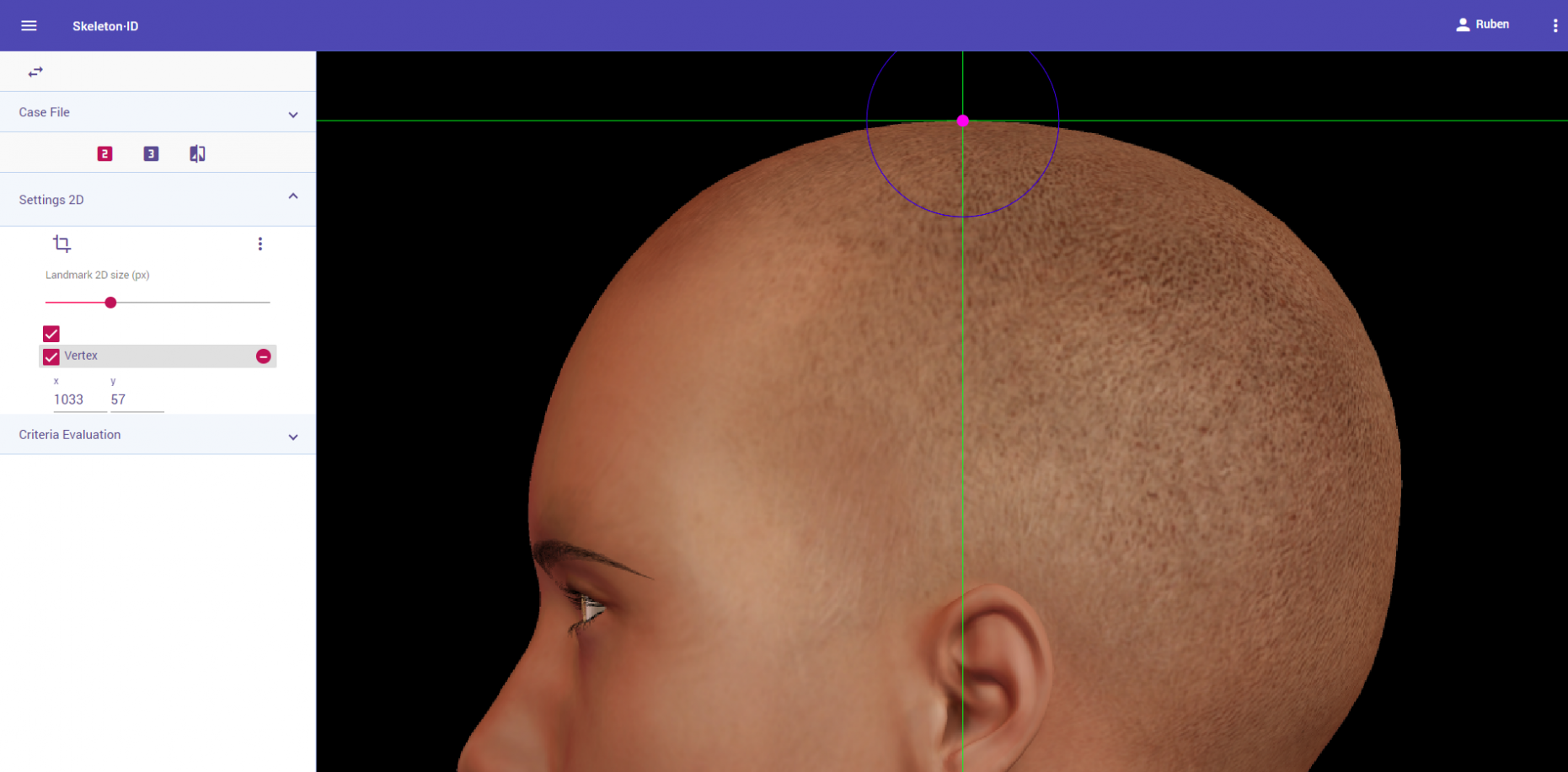 Colocar vertex sobre el punto más alto de la cabeza en vista lateral. Utilizar la línea horizontal como referencia. La línea horizontal debe estar en contacto con el borde más superior del contorno de la cabeza y la línea vertical en la intersección con el punto más prominente.