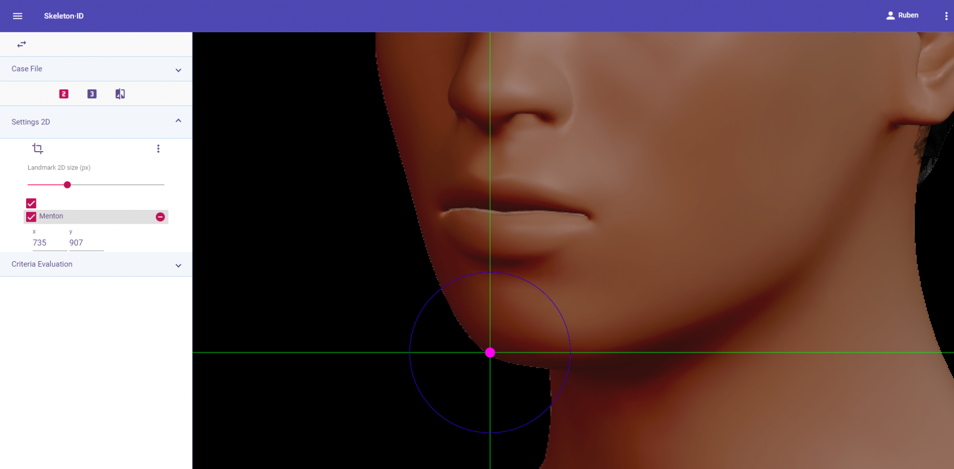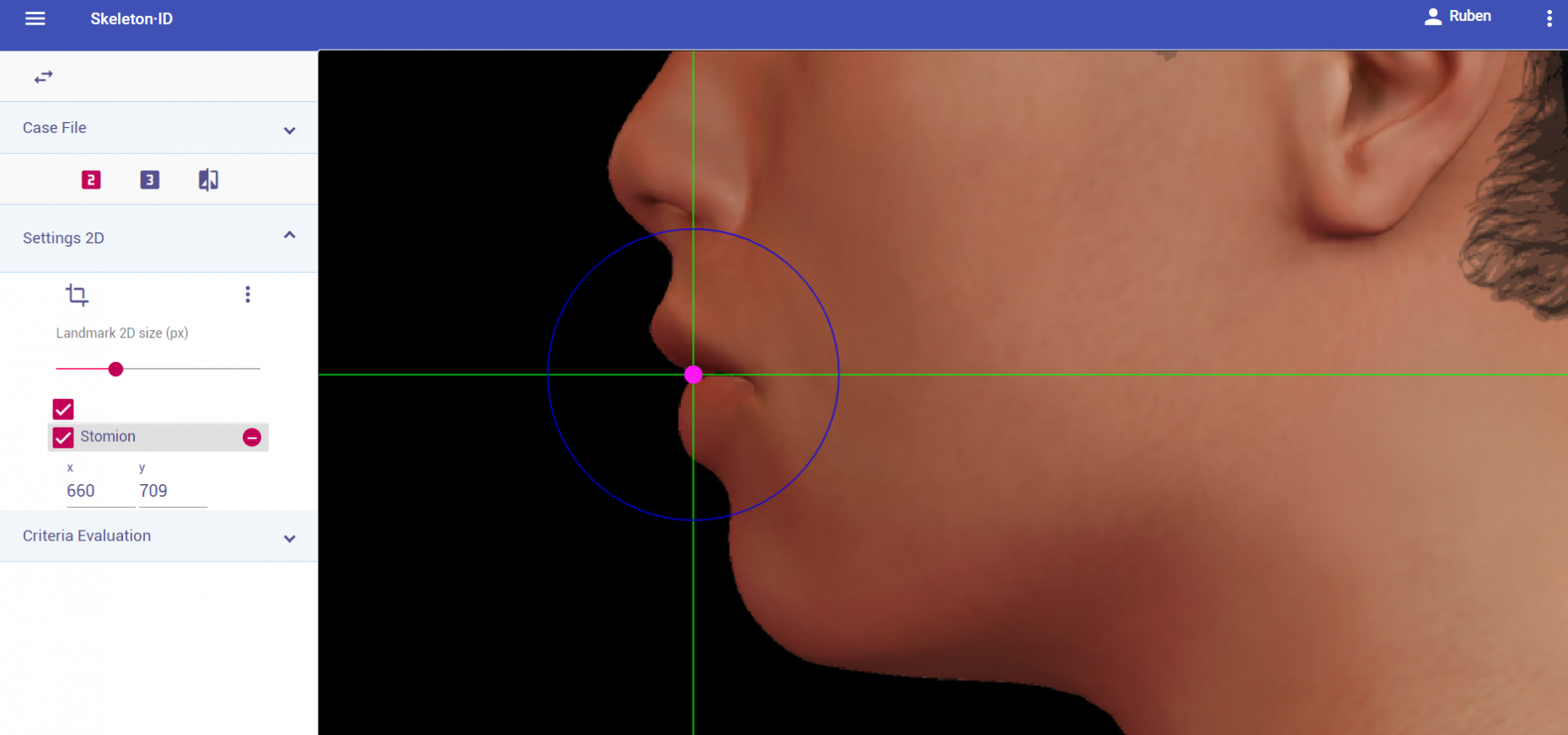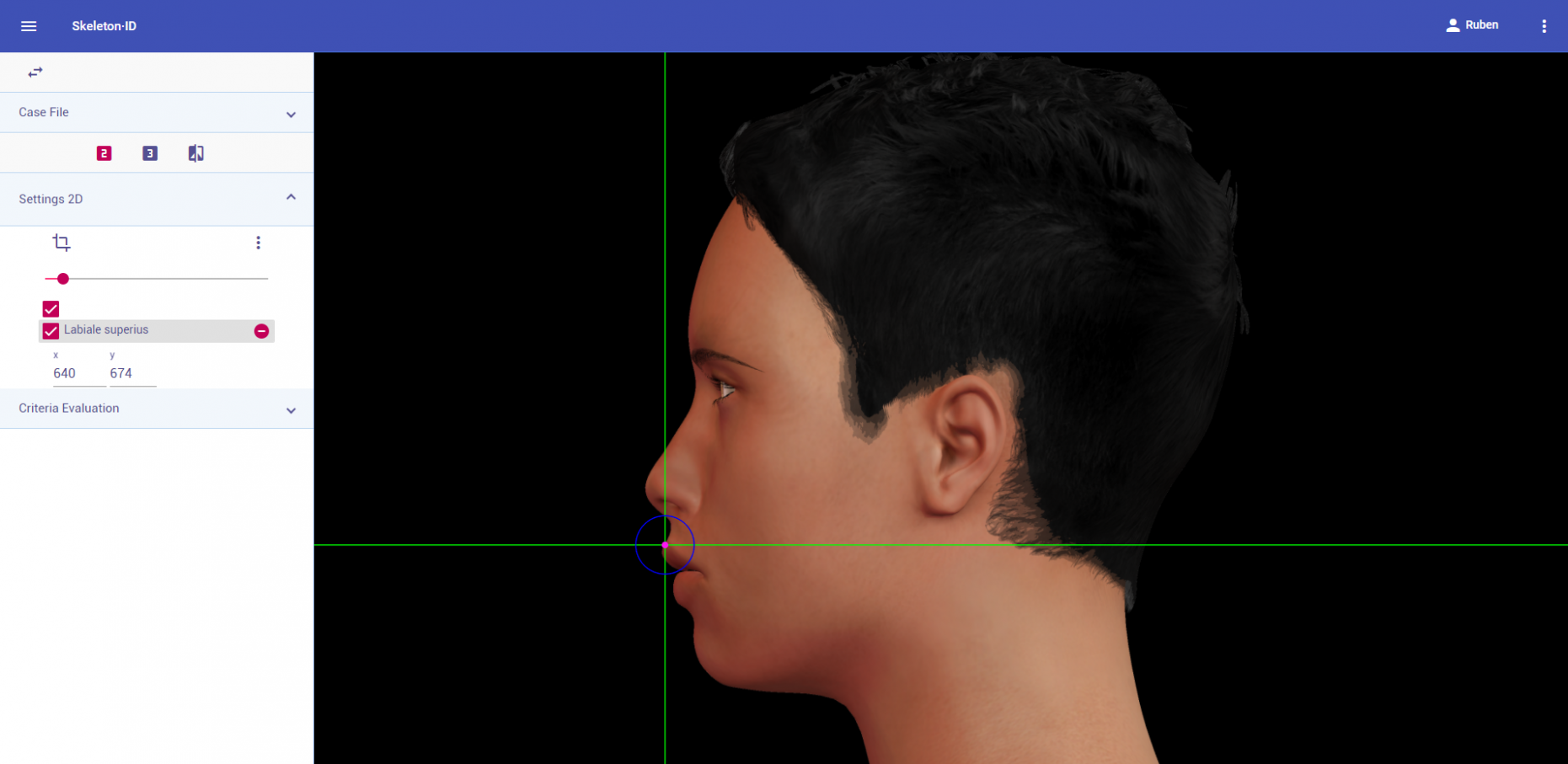 Colocar el punto subnasale en el punto más profundo situado en el ángulo de la unión del tabique nasal y el filtrum labial. Primeramente, la línea horizontal debe colocarse a la altura de la unión del tabique nasal con el filtrum y posteriormente, la línea vertical debe situarse en el borde de mayor profundidad de la base nasal.