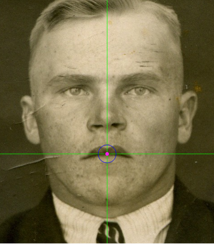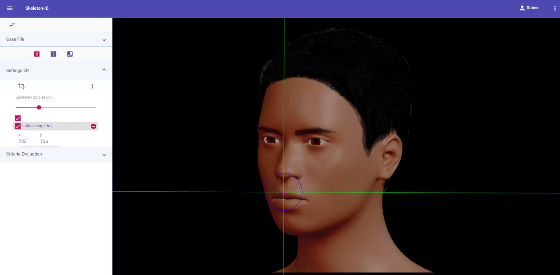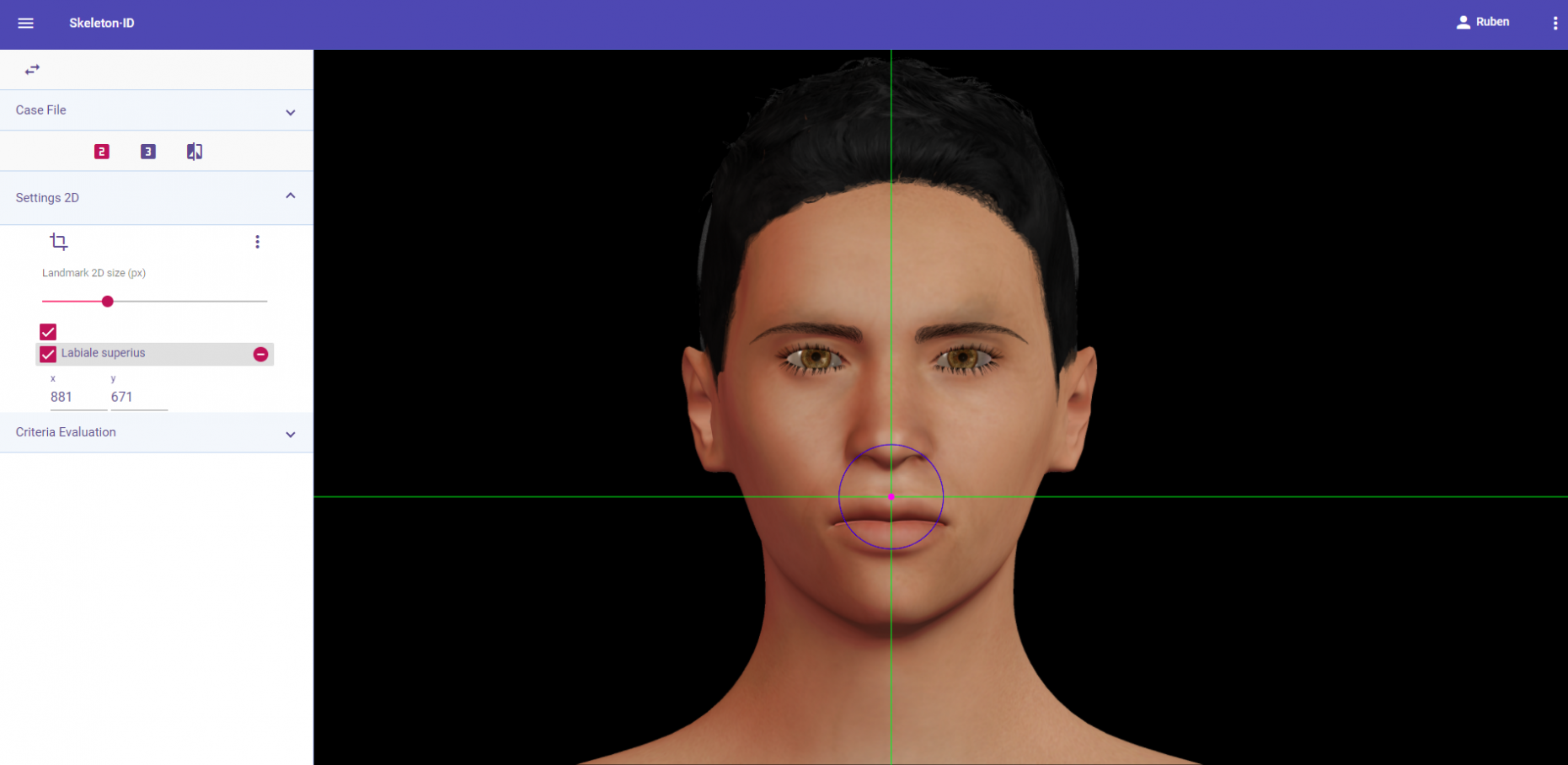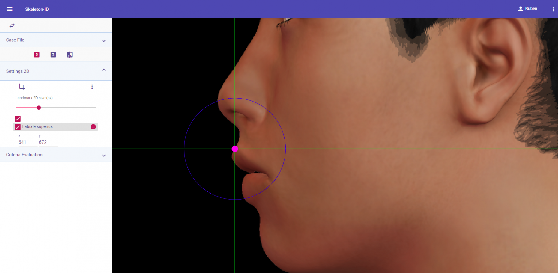 Colocar labiale superius sobre el borde superior del bermellón superior (línea de transición desde el bermellón de la boca hasta la piel circundante), en la porción inferior del vértice del arco de cupido (región medial del labio superior) en vista frontal. La línea horizontal debe estar situada sobre el borde de la porción inferior del arco de cupido y la línea vertical en la región medial del labio superior.