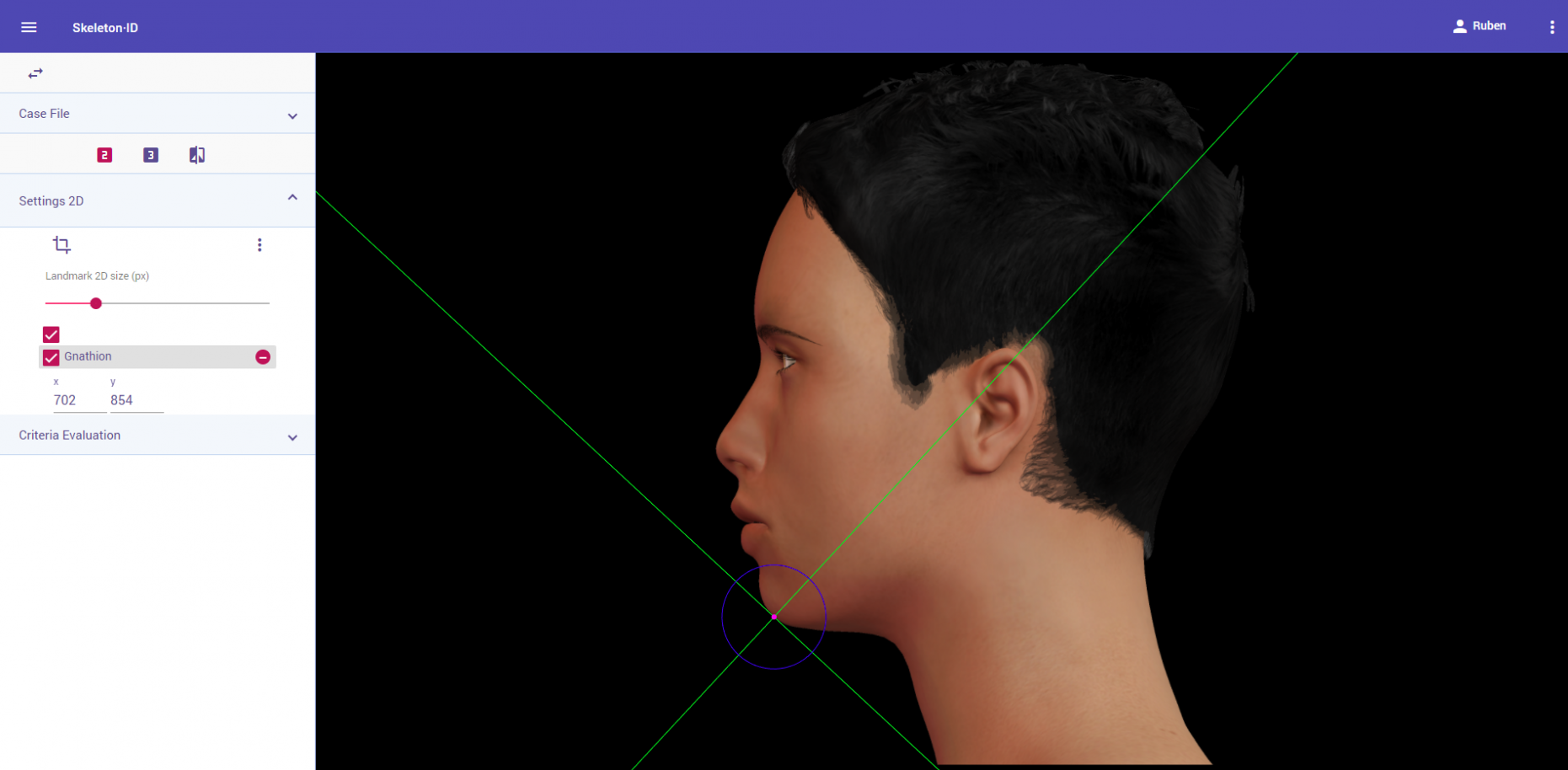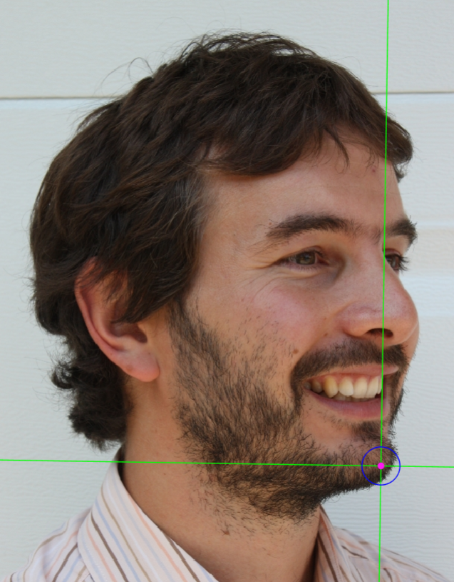 Colocar gnathion en el punto medio entre el punto más anterior y el punto más inferior de la barbilla. Utilizar la línea vertical auxiliar como referencia. Nótese que para determinar los puntos más anterior e inferior del contorno de la barbilla será necesario rotar el eje de las líneas auxiliares de forma paralela al contorno inferior de la barbilla.