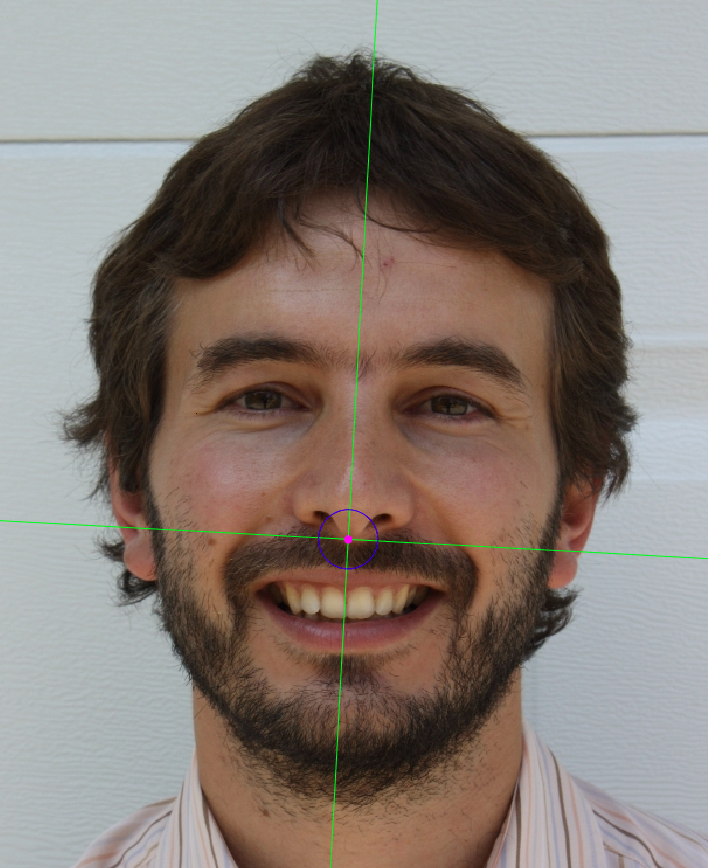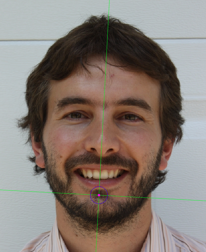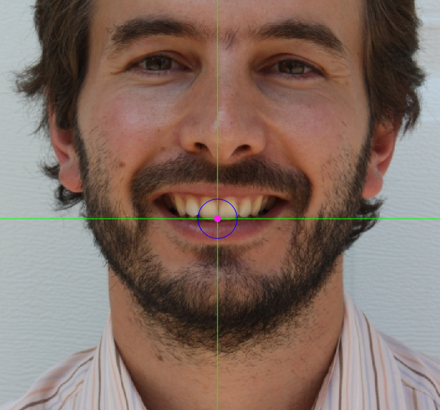 Colocar stomion en la línea de oclusión de los labios, en el plano medio cuando estos están cerrados de manera natural en vista frontal. La línea horizontal debe estar colocada en la línea de oclusión y la línea vertical en la región media labial.