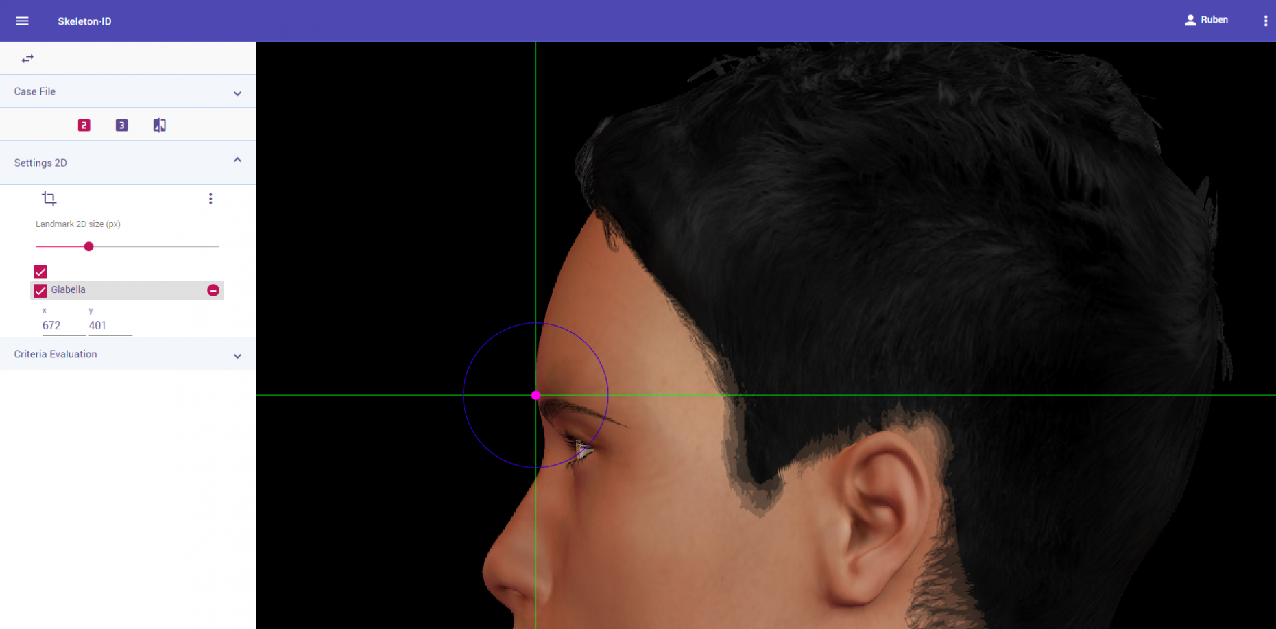 Colocar glabela en el punto medio de la frente a nivel del arco supraorbital, a la altura del borde superior de las cejas. Utilizar la línea auxiliar vertical y horizontal como referencia. La línea vertical debe estar situada en el punto medio del arco supraorbital y la línea horizontal sobre el borde superior de las cejas. Nótese que puede ser necesario girar el eje de las líneas auxiliares para situar la línea horizontal sobre las cejas.