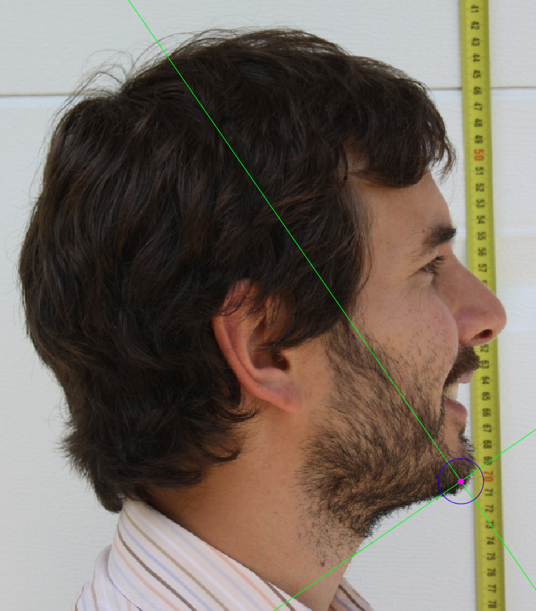 Colocar pogonion en el punto más prominente de la protuberancia mentoniana en vista lateral. La línea vertical debe situarse en el borde exterior de la protuberancia mentoniana, en el punto más prominente. La línea horizontal deberá situarse a la altura de dicho punto. Nótese que para determinar el punto de máxima protuberancia del contorno del mentón será necesario rotar el eje de las líneas auxiliares de manera que sea paralelo al contorno de la barbilla.