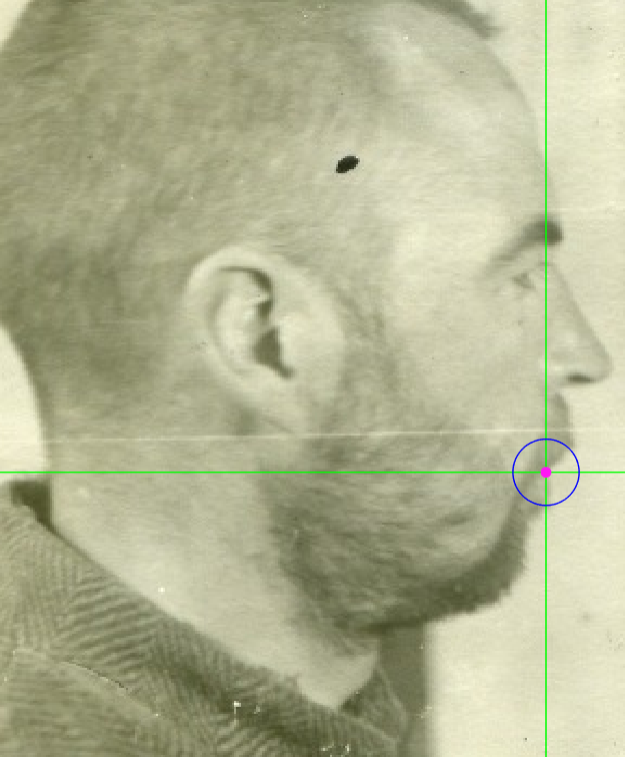 Figura 78. Marcado de gnathion en una fotografía en vista frontal (izquierda), vista lateral (derecha) y vista oblicua (derecha).