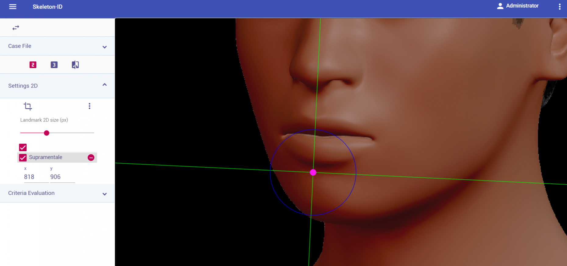 Colocar supramentale en la región entre el labio inferior y la barbilla, en la zona media del surco mentolabial en vista frontal. Primeramente, la línea horizontal debe situarse en la mitad del surco mentolabial y posteriormente, la línea vertical debe situarse en el plano medial de la barbilla.