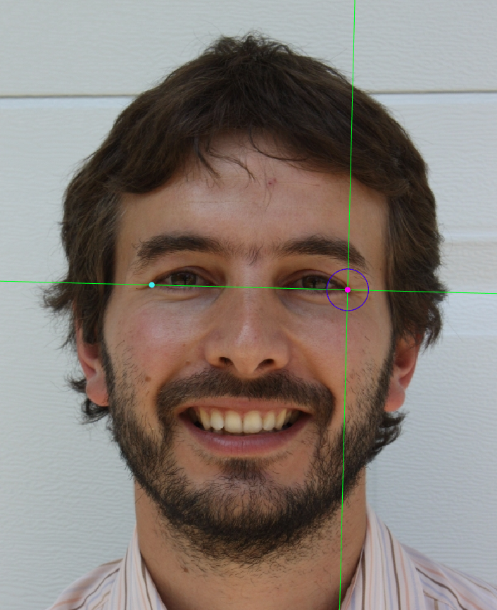 Hacer zoom en el ojo y situar el cursor sobre la comisura lateral, en el punto donde convergen las líneas de implantación de las pestañas en vista oblicua. Para una mayor precisión la línea auxiliar vertical debe estar situada en la comisura lateral del ojo y la línea auxiliar horizontal en el punto donde convergen las líneas de implantación de las pestañas. Nótese que en una vista oblicua puede ser imposible de determinar el canto lateral de alguno de los dos ojos.