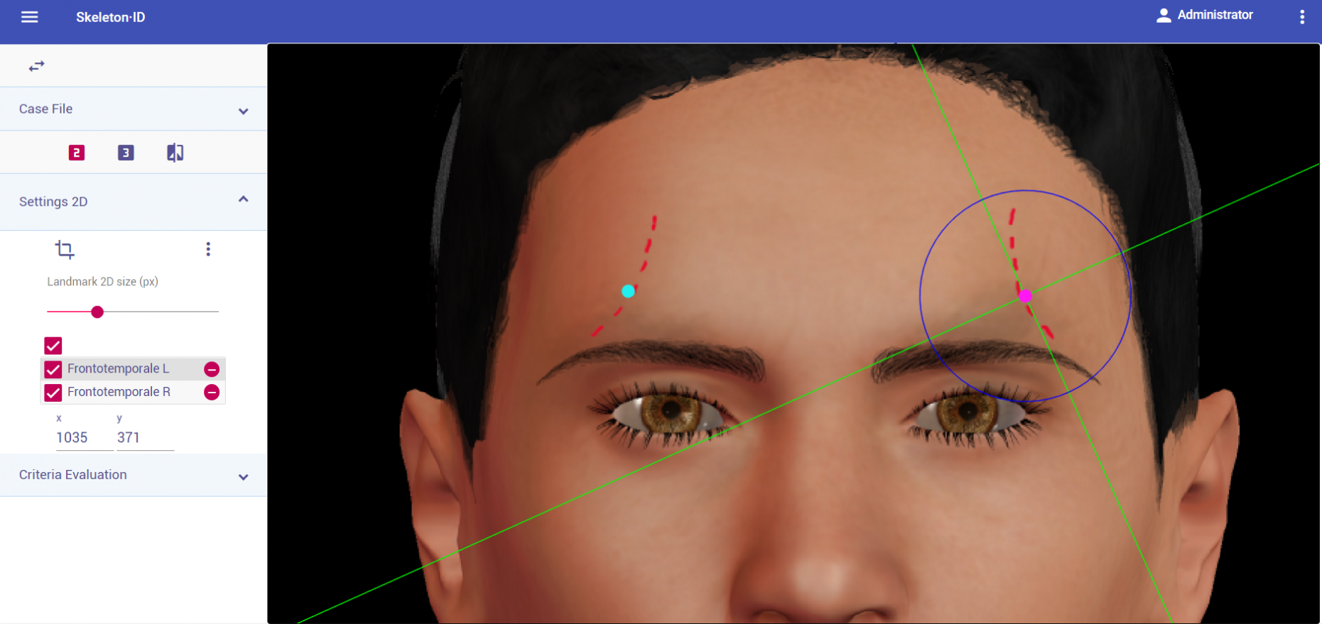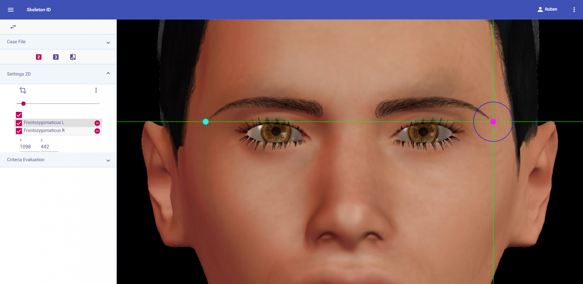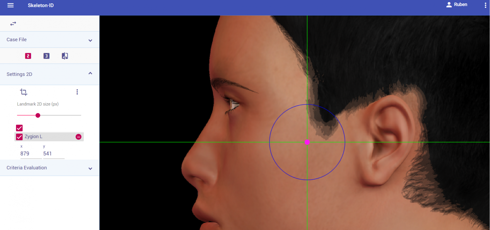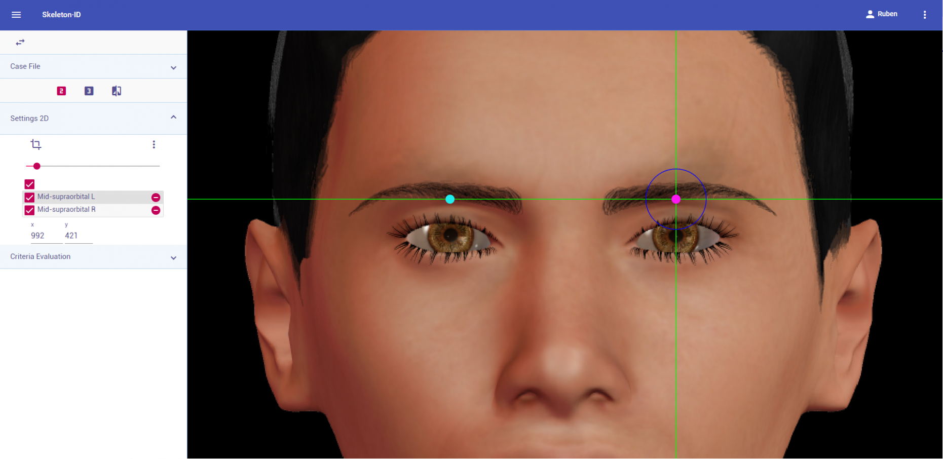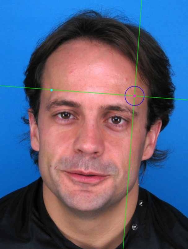 Marcar este punto en la región más baja del borde superior de la órbita en el plano medio del ojo. Utilizar como referencia las líneas auxiliares vertical y horizontal. La línea horizontal debe estar situada sobre el borde superior de la órbita (normalmente en la zona más baja de la ceja) y la línea vertical debe estar situada en el plano medio del ojo (no tiene por qué coincidir con la pupila). Nótese que en función de la orientación de la cara puede ser necesario girar las líneas auxiliares para situarlas en la posición adecuada. Seguir el mismo procedimiento para marcar el punto contralateral.