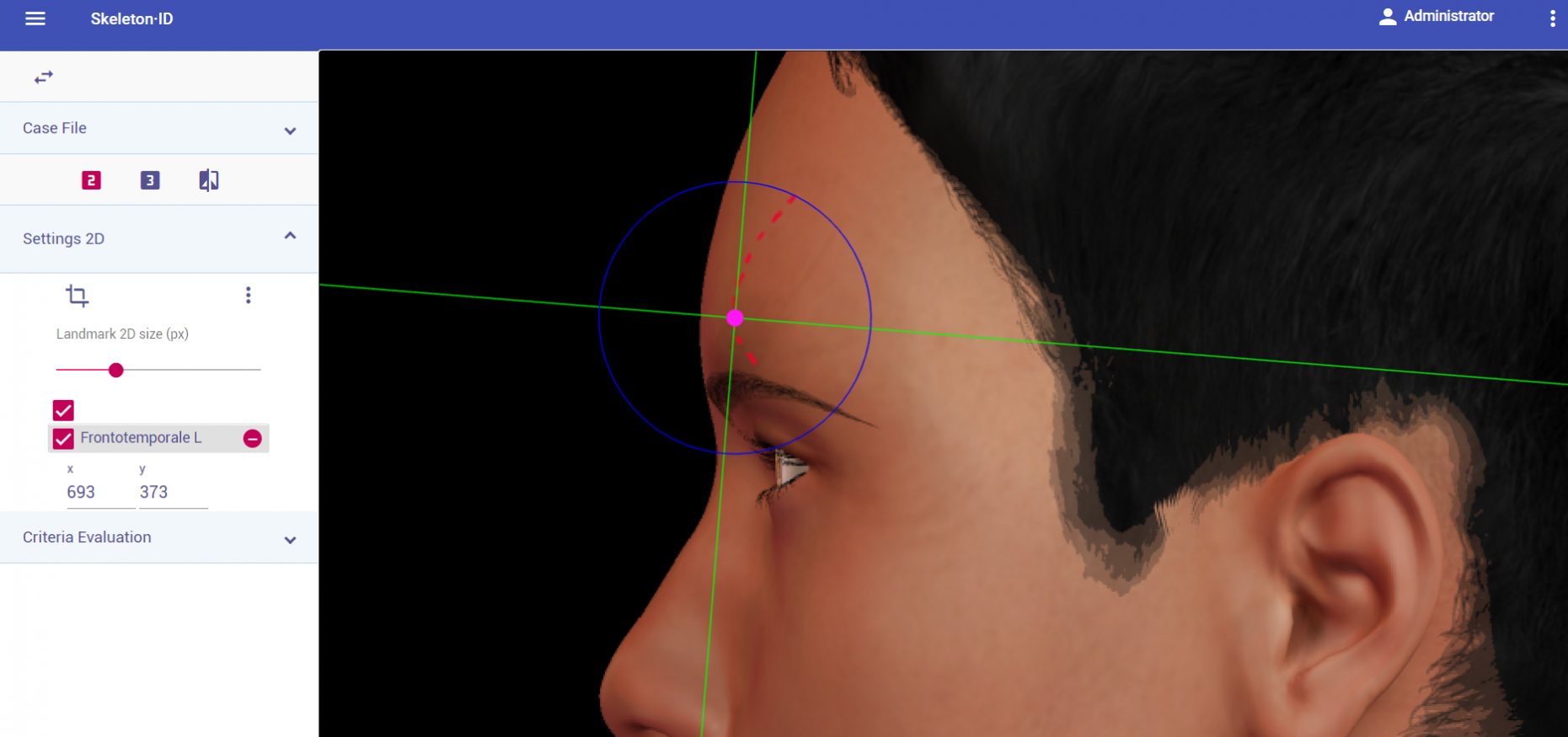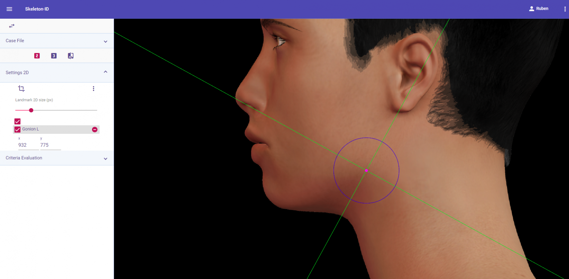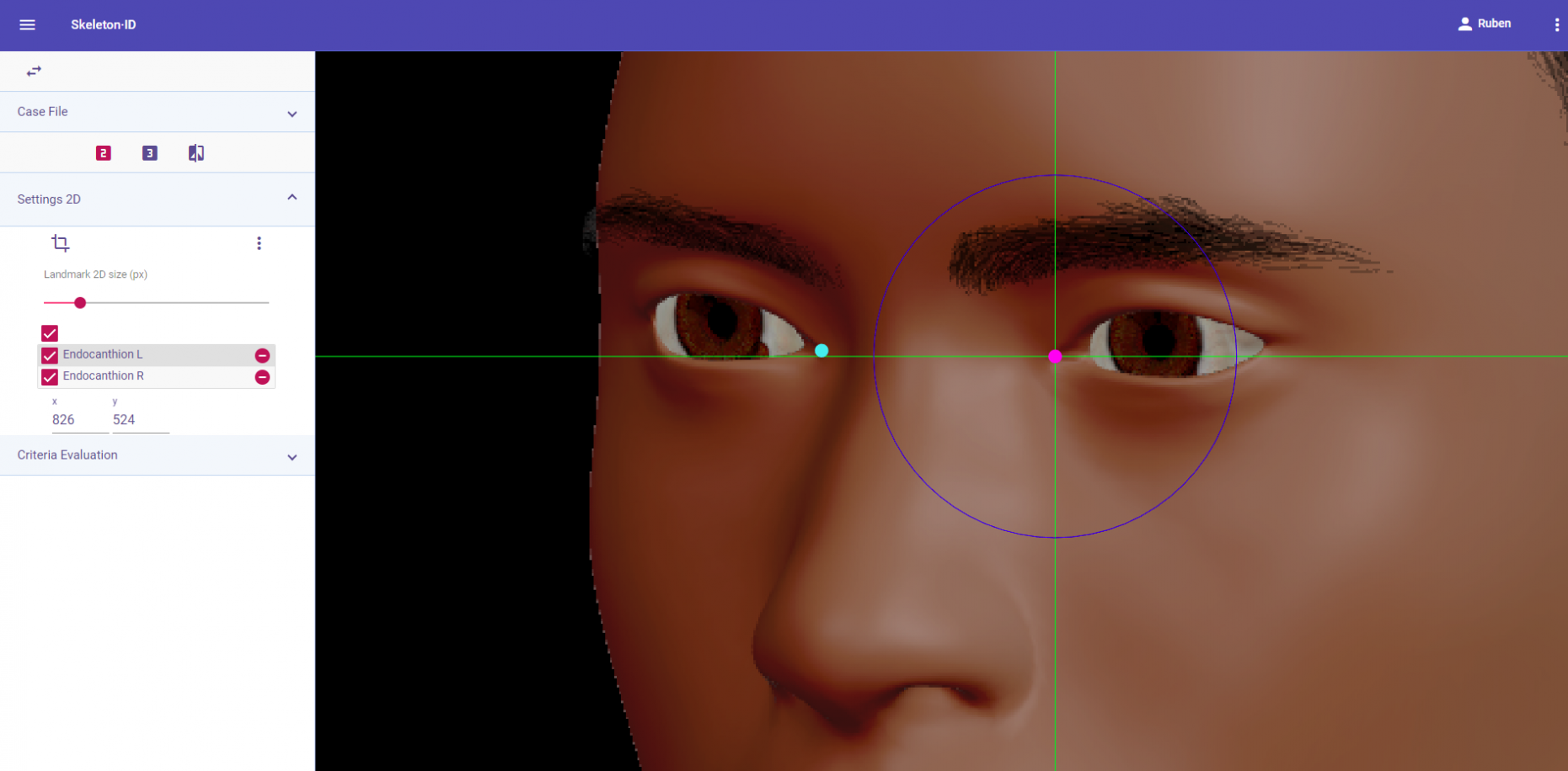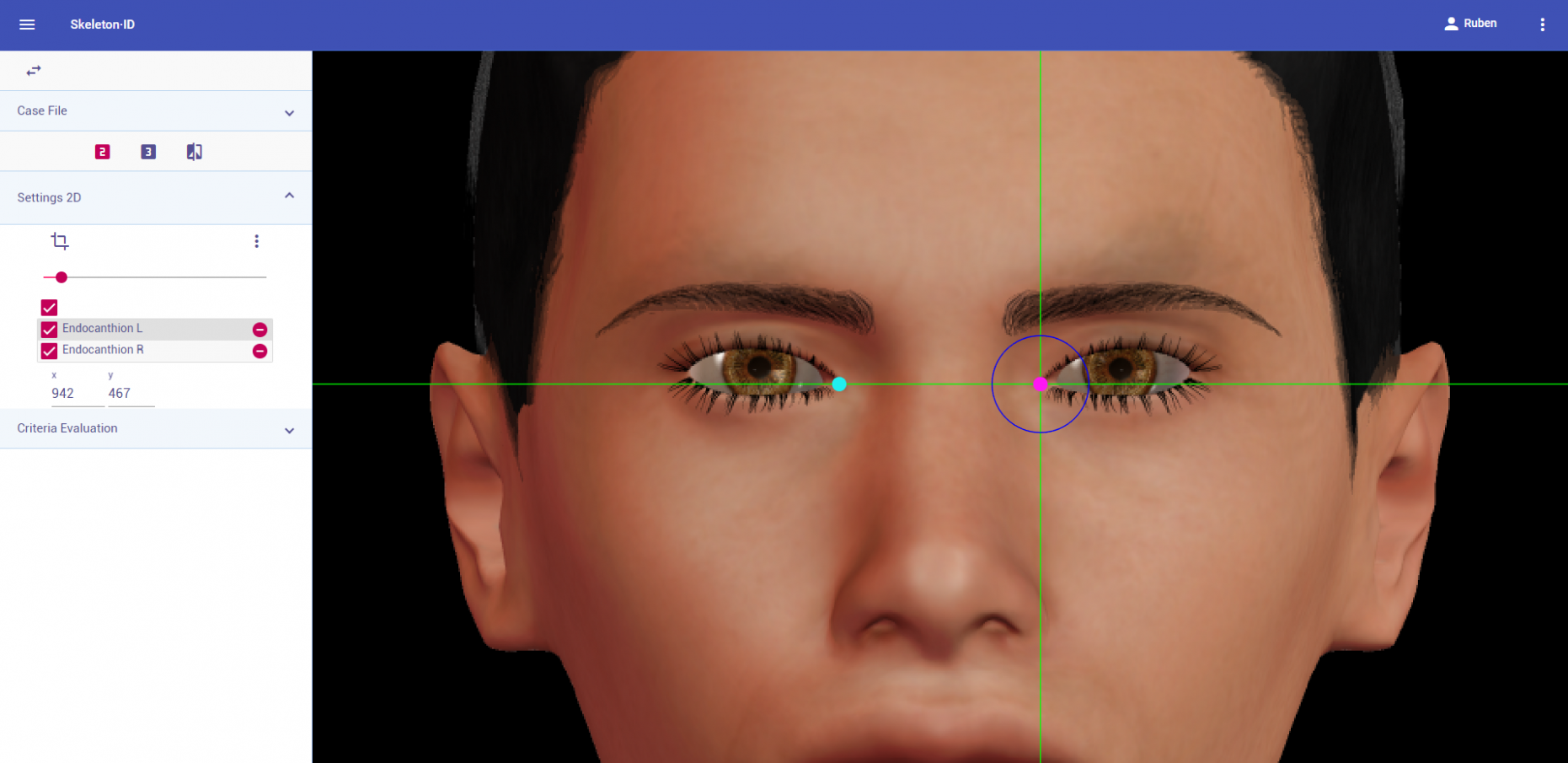 Marcar este punto en la región más baja del borde superior de la órbita en el plano medio del ojo. Utilizar como referencia las líneas auxiliares vertical y horizontal. La línea horizontal debe estar situada sobre el borde superior de la órbita (normalmente en la zona más baja de la ceja) y la línea vertical debe estar situada en el plano medio del ojo (no tiene por qué coincidir con la pupila). Nótese que en función de la orientación de la cara puede ser necesario girar las líneas auxiliares para situarlas en la posición adecuada. Seguir el mismo procedimiento para marcar el punto contralateral.