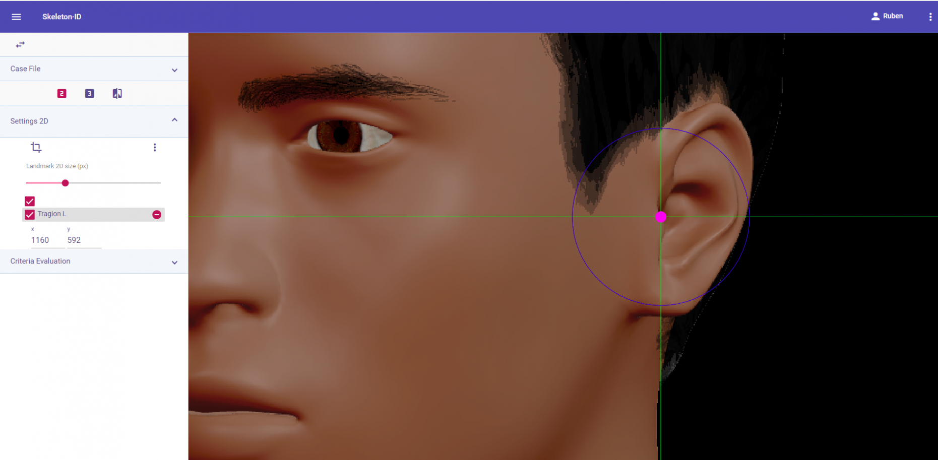 Marcar el punto en la región lateral entre la zona en la zona de inserción del hélix y el trago. La línea vertical debe estar situada delante de la región capilar (en el tejido cutáneo) y la línea horizontal entre el hélix y el trago alineada con la región inferior de la órbita. Este punto presenta una gran variabilidad en vista oblicua por la dificultad de su estimación. Nótese que dependiendo de la pose puede ser necesario girar la línea horizontal para alinear la zona de la raíz del hélix y el trago con la órbita.