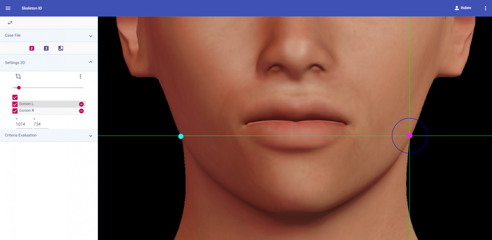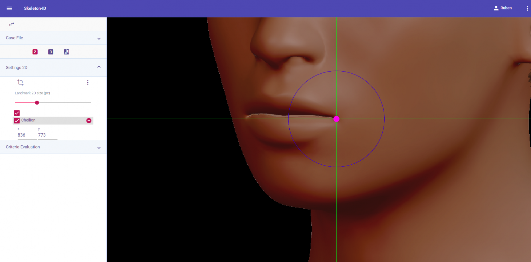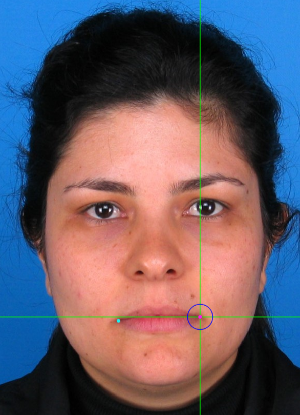 Colocar cheilion en la comisura lateral de los labios en vista lateral. La línea vertical debe estar colocada en el lateral de la boca (comisura de los labios) y la línea horizontal sobre la línea oscura formada por la unión de ambos labios en la comisura. Nótese que el punto contralateral no se puede estimar en una imagen en vista lateral.